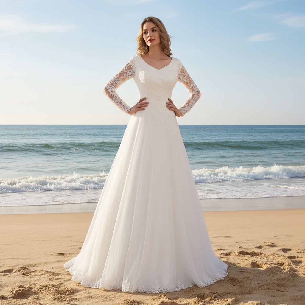 Elevate your bridal vision with this timeless wedding dress, meticulously crafted for the modern bride seeking sophistication and romance. The sheer long sleeves and flattering V-neckline frame the face beautifully, while delicate tulle and intricate floral lace appliqués create an ethereal, feminine silhouette. The graceful A-line skirt flows elegantly, offering both comfort and movement for your special day. Thoughtful design details include a romantic V-back, a discreet zipper closure, and a charming line of buttons descending to the brush train—adding vintage-inspired elegance. Perfect for traditional ceremonies, garden celebrations, or intimate gatherings, this dress balances classic bridal aesthetics with contemporary refinement, ensuring you feel confident and radiant as you walk down the aisle.