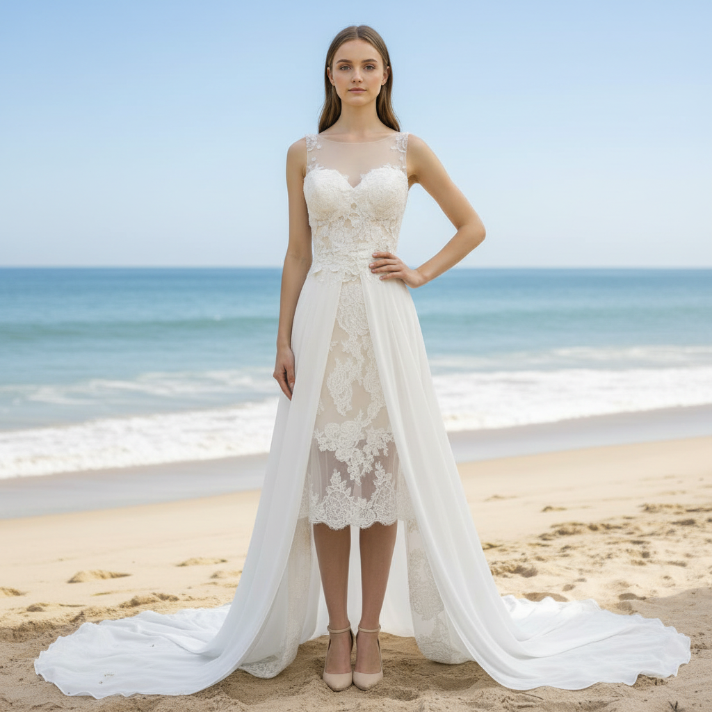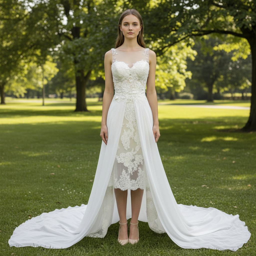 This elegant wedding dress features a sweetheart neckline and sheer lace detailing, adding a touch of romance to your special day. The detachable skirt allows for versatility and convenience, providing options for different looks throughout the celebration. Make a statement in this mermaid high low wedding dress.