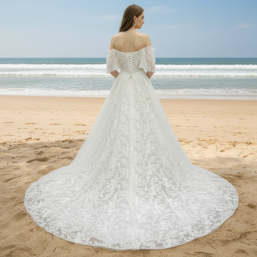 Expertly crafted for a captivating and romantic presence, this Off the Shoulder Floral Lace Ball Gown Wedding Dress combines timeless elegance with modern sophistication. The deep sweetheart neckline beautifully frames your décolletage, seamlessly blending into delicate off-the-shoulder straps that accentuate your collarbones and shoulders with a soft, feminine attractive. The bodice is a masterpiece of craftsmanship, intricately embellished with floral lace appliqués that catch the light and add subtle shimmer, enhancing the gown’s luxurious texture. These exquisite details flow effortlessly onto the voluminous full tulle skirt, which moves with grace to create a dreamy, ethereal silhouette that feels straight out of a fairytale. Designed with a corset back, this gown not only sculpts your figure for a stunning hourglass shape but also provides customizable support and comfort throughout your celebration. The dramatic train trails elegantly behind, leaving a lasting impression as you make your grand entrance. Perfect for brides seeking a combination of romantic softness and regal drama, this ball gown promises to transform your wedding day into a truly unforgettable experience, radiating beauty and confidence with every step you take.