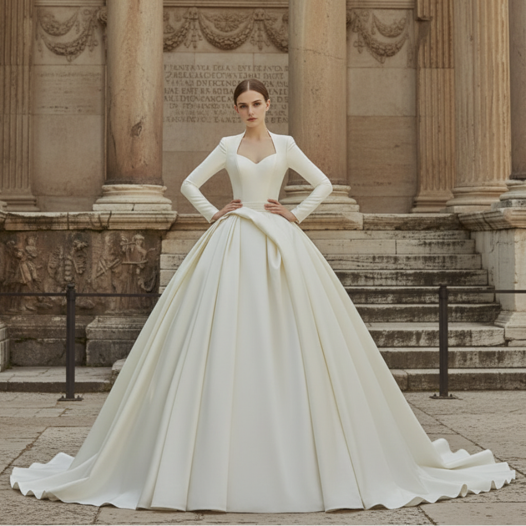 Queen-ann Neck Long Sleeve Wedding Dress with High Back