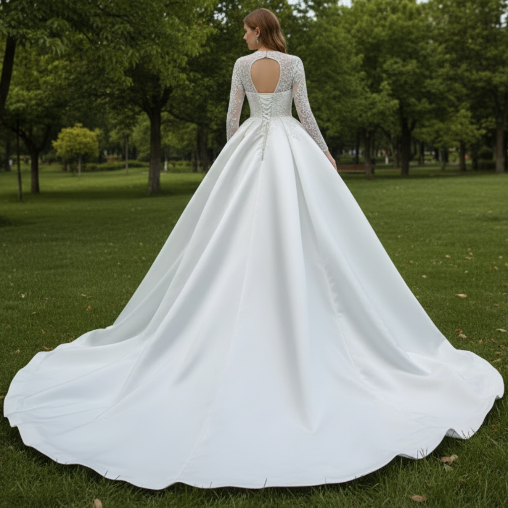 Discover the perfect synthesis of tradition and contemporary elegance in this breathtaking pearl satin wedding dress, meticulously crafted for the modern modest bride. The gown showcases a sophisticated Queen Anne neckline that gracefully frames the collarbone while providing elegant coverage, seamlessly transitioning into a flattering V-neck design enhanced with delicate pearl beading and crystal embroidery. The dramatic keyhole back, adorned with intricate lace appliqué and satin ribbons, creates a stunning focal point while maintaining the dress's modest aesthetic.