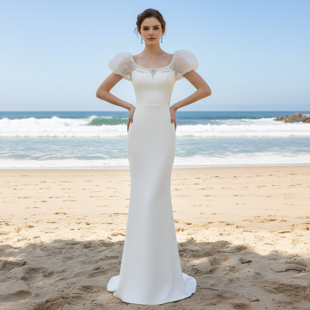 Make a grand entrance in this stunning mermaid wedding dress. With a slim fit, back slit, and dainty short sleeves, its charming style will make you the belle of the ball. Look effortlessly luminous on your special day.