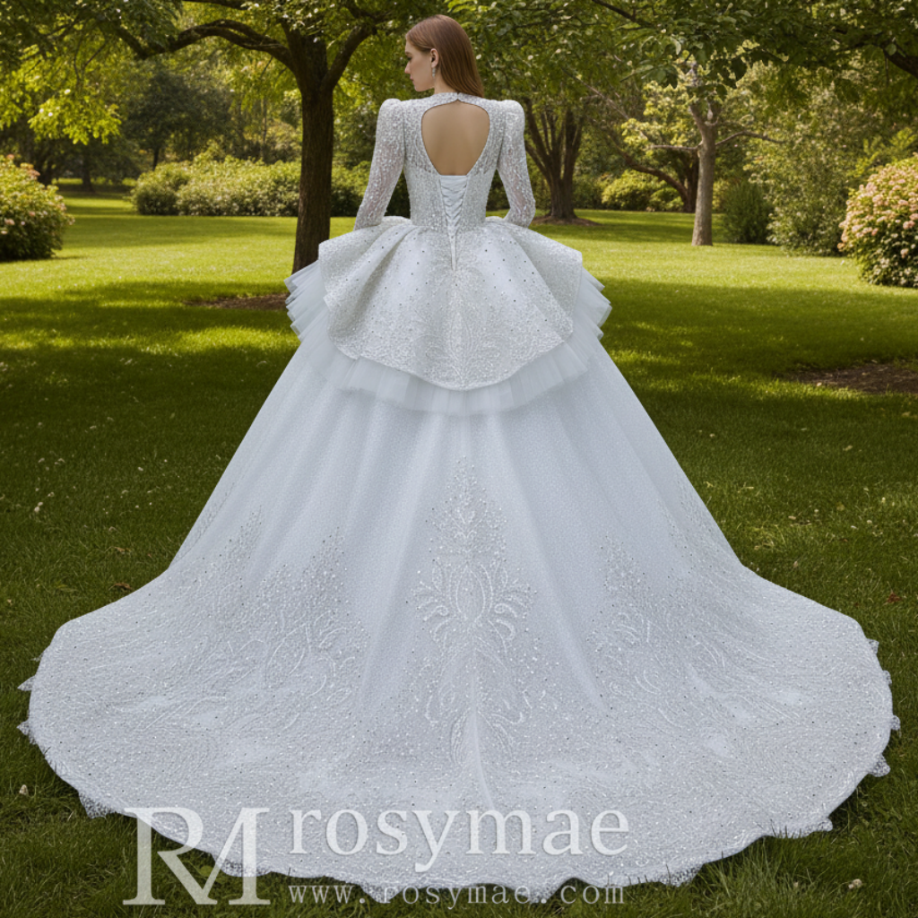 Capture timeless grandeur in this luxurious long sleeve wedding dress, where artisanal craftsmanship meets fairytale design. The elegant high O-neck, delicately enhanced with sheer illusion detailing, frames the silhouette with refined grace. Meticulously handmade with precision, the gown features a voluminous puffy skirt and sweeping train, all adorned with radiant sparkle that catches the light with every movement. Designed to make a breathtaking entrance, this one-of-a-kind dress ensures you step into your special day with confidence and unforgettable elegance.