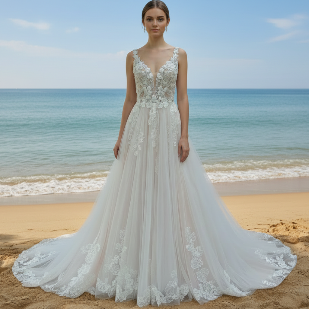 Step into your wedding day with unmatched elegance wearing this beautiful A-line dress that effortlessly enhances your natural curves. The deep V-neck gracefully elongates your neckline, adding just the right amount of sophistication and sensuality, while the tank top design offers secure support and a sleek, contemporary fit. Crafted from lightweight, breathable fabric, this dress ensures all-day comfort, allowing you to move freely and confidently from your ceremony to the celebration. Designed to balance classic bridal charm with modern style, it flows gently from the waist, creating a silhouette that moves gracefully with every step. The timeless A-line cut flatters every figure, making you feel radiant and poised as you create unforgettable memories. Whether exchanging vows or dancing late into the night, this gown embraces your love story with elegance and attractive, making you the center of attention on your special day. Choose this elegant wedding dress to embody beauty, confidence, and romance all in one stunning piece.