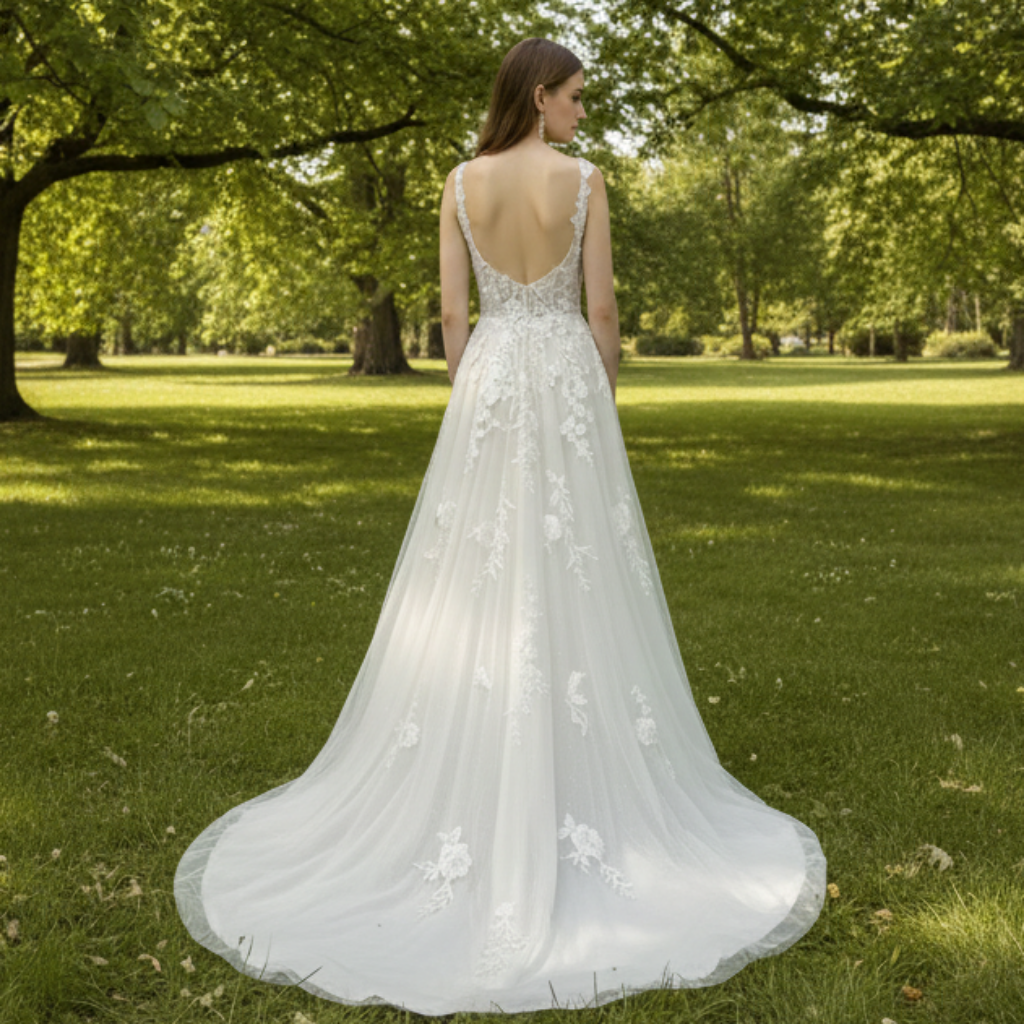 Embody elegance and grace in this sheer bodice tulle and lace A-line wedding dress. Designed with a flattering v-neckline and delicate lace detailing, this dress will showcase your beauty and style on your special day. The open back adds a touch of charming, while the chapel train adds a touch of sophistication. Perfect for the modern bride searching for the perfect blend of romance and fashion.