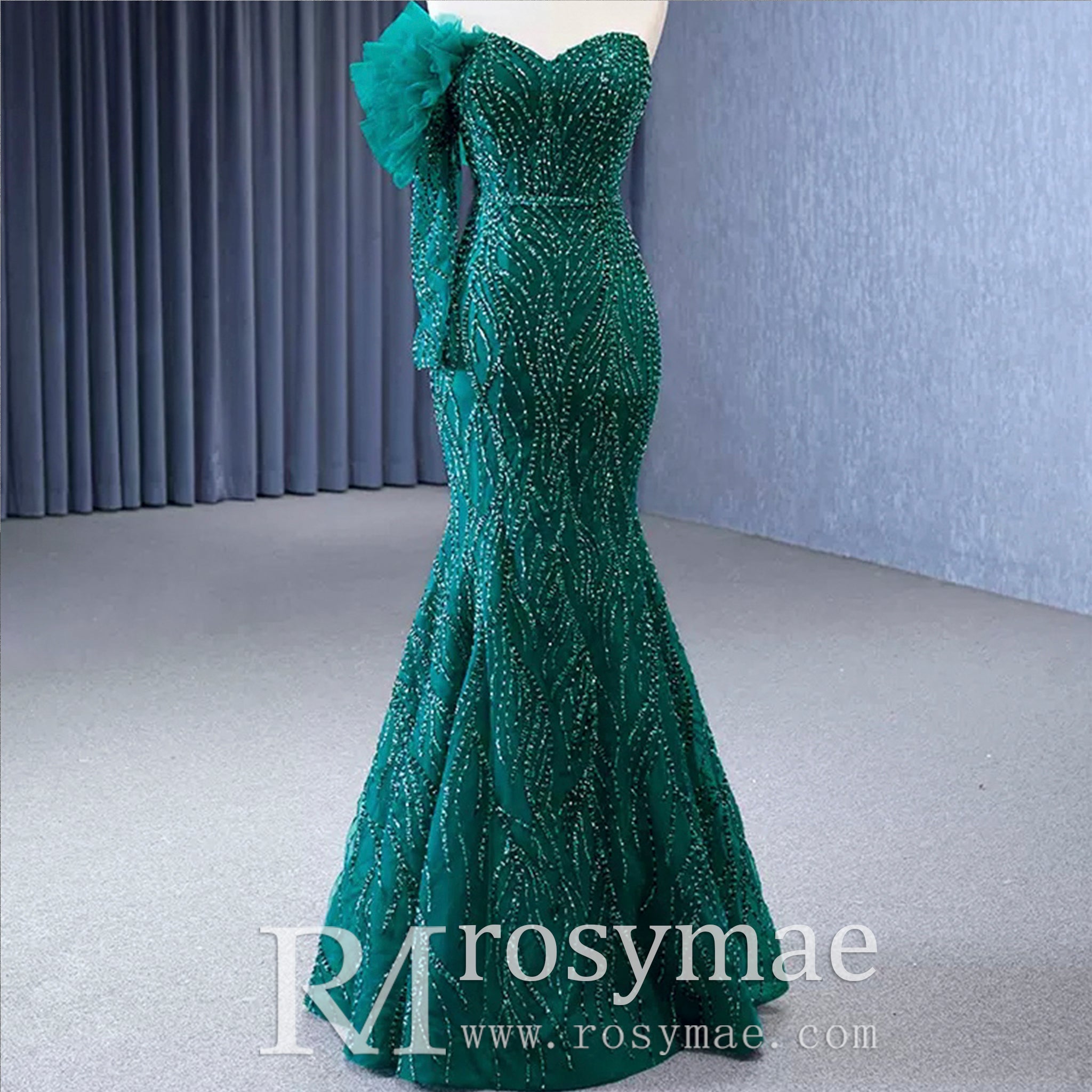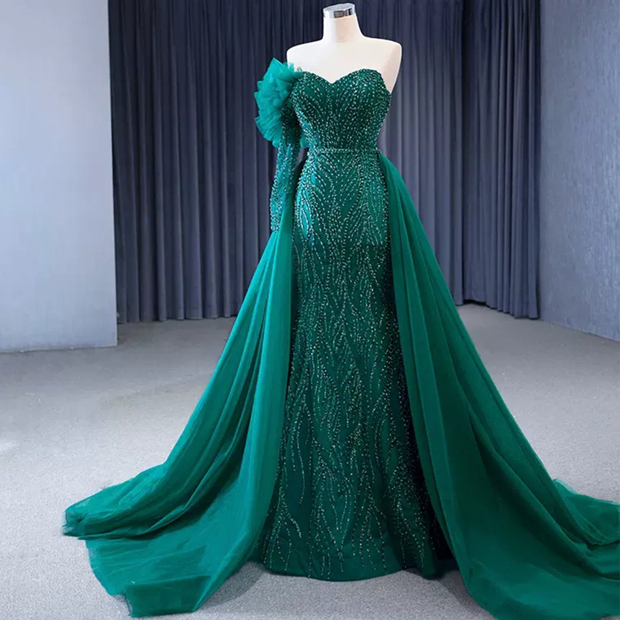 Elevate your evening glamour with this stunning beaded green mermaid evening dress. The removable overskirt and one shoulder design add a touch of elegance and versatility to this formal dress. Featuring intricate beadwork and a figure-hugging silhouette, this dress will make you feel like a glamorous mermaid!