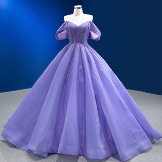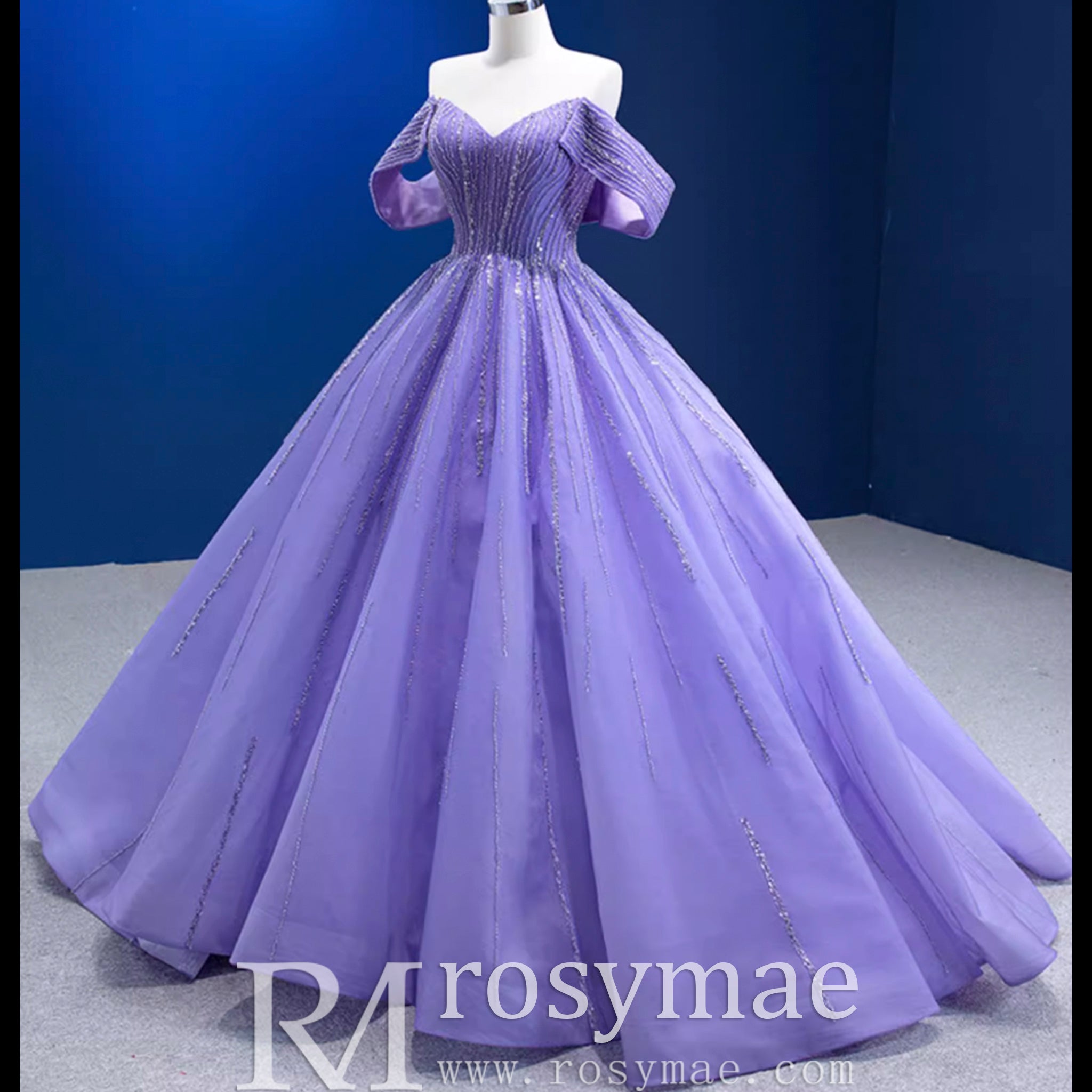 Get ready to turn heads in this beaded ball gown quince dress with removable sleeves. Handmade with expert craftsmanship, this dress combines luxurious fabrics tulle and stunning detailing to create a couture formal dress fit for a princess. The off-the-shoulder design and corset back add a touch of celebrity style, while the removable sleeves and exquisite lace appliques make it a versatile and unique choice for any occasion. Elevate your quinceanera or formal event with this eye-catching lavender gown.