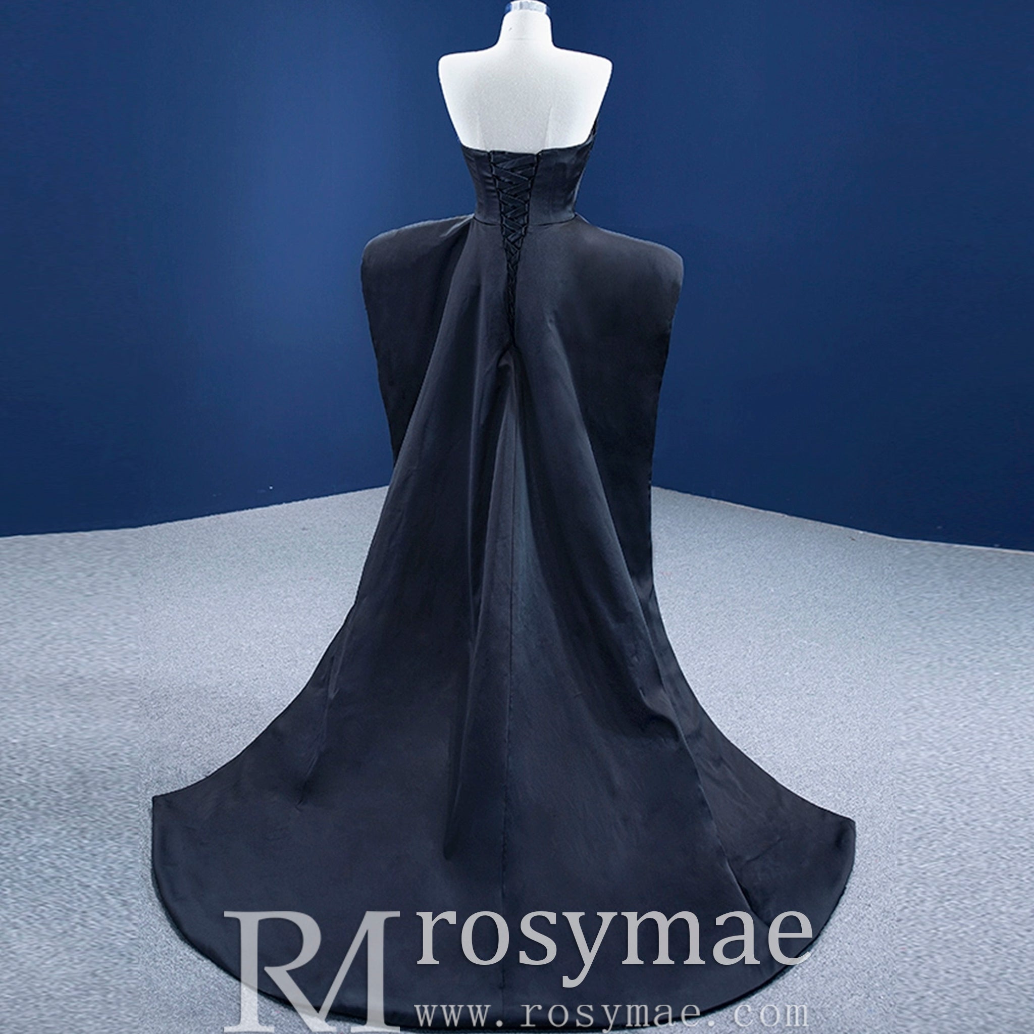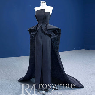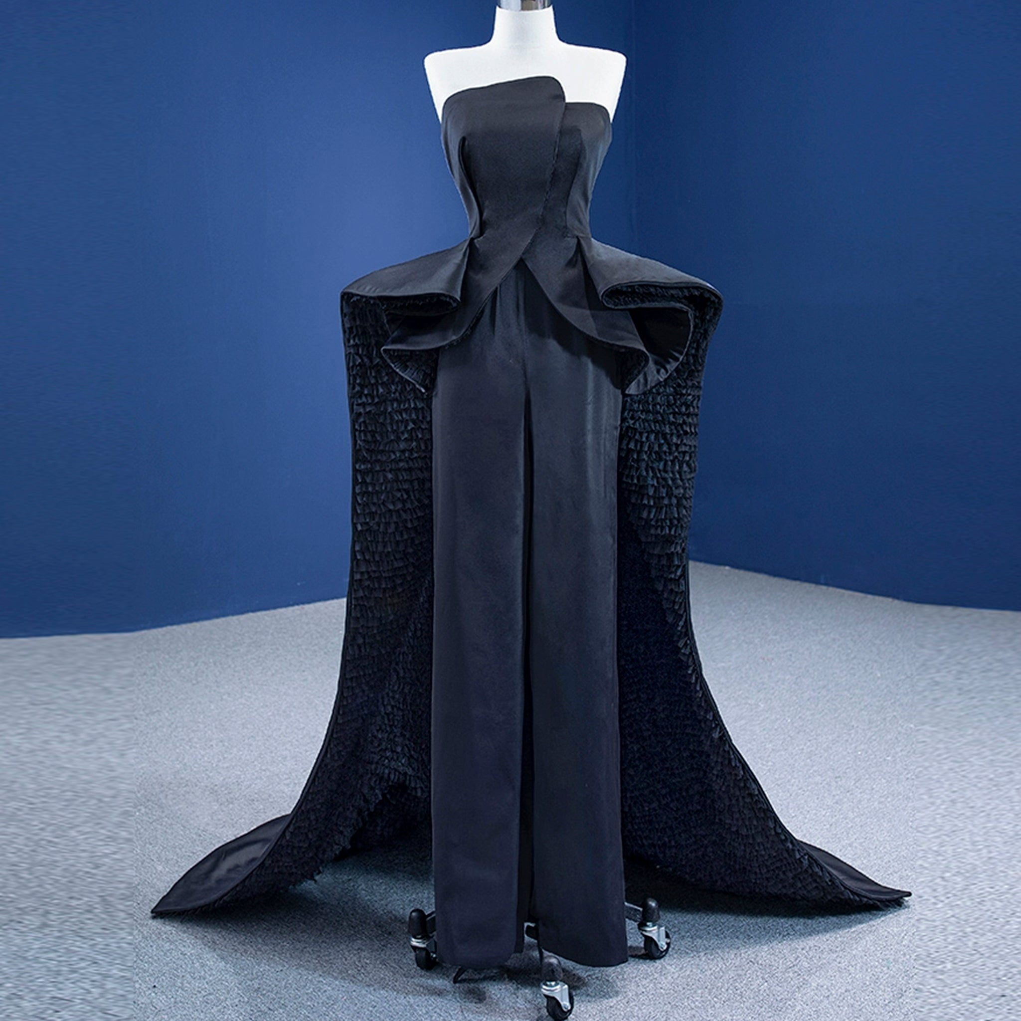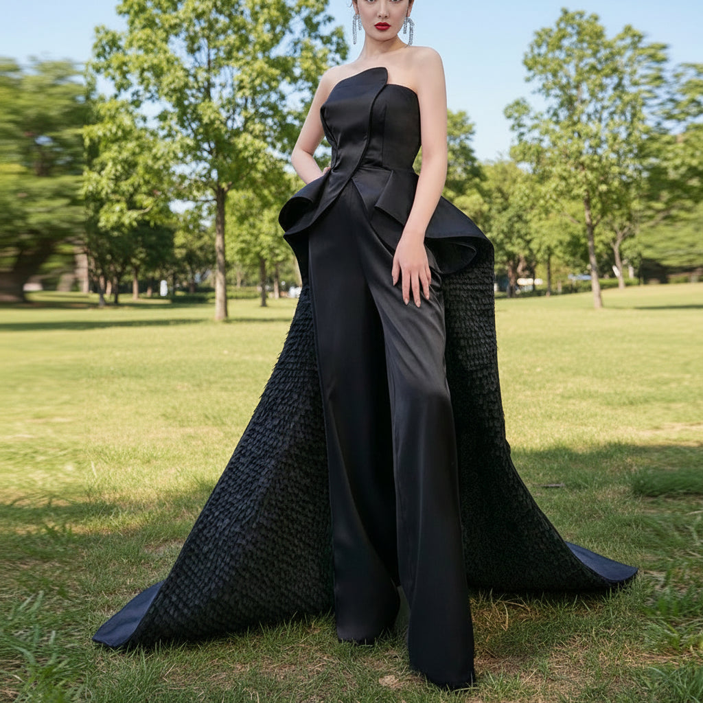 Revolutionize your formal wardrobe with our exquisitely crafted vintage-inspired black overskirt jumpsuit, where timeless elegance meets contemporary design. Meticulously handmade by skilled artisans, this stunning ensemble showcases exceptional craftsmanship in every detail, from the precision of its tailoring to the artistry of its decorative elements. The dramatic asymmetrical neckline creates an instant focal point, beautifully framing your collarbones and shoulders while adding a modern, fashion-forward edge to the classic silhouette.