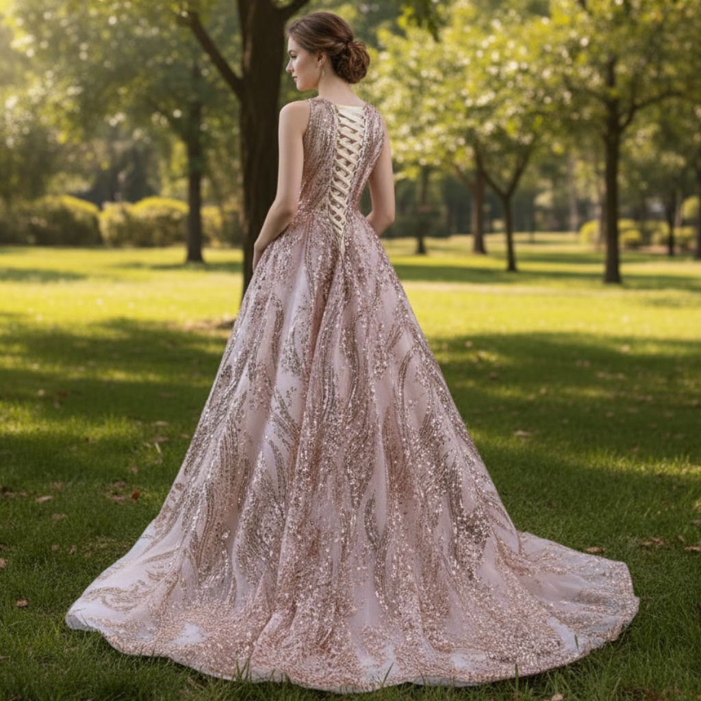 Elevate your formal wardrobe with this breathtaking rose gold sequin lace prom dress, a masterpiece designed for those who refuse to blend into the background. Each bead and sequin is carefully placed by hand, creating an intricate lace overlay that catches and reflects light with every movement, ensuring you shimmer throughout the night. The refined high neckline exudes timeless elegance while the generously proportioned A-line skirt flatters every figure, creating that coveted princess silhouette that looks stunning in photographs and in person. The dramatic sweep train adds theatrical grandeur, trailing gracefully behind you as you make your entrance and dance the night away. This versatile gown transitions effortlessly from prom to galas, formal dinners, and black-tie events, making it an investment piece you'll treasure for years. The champagne gold sequin lace creates a warm, luminous glow against the skin, complementing a variety of skin tones beautifully. Handcrafted with meticulous attention to detail, this dress embodies luxury and sophistication, giving you the confidence to own every moment of your special occasion. Perfect for those seeking an unforgettable formal look that combines contemporary sparkle with timeless elegance.
