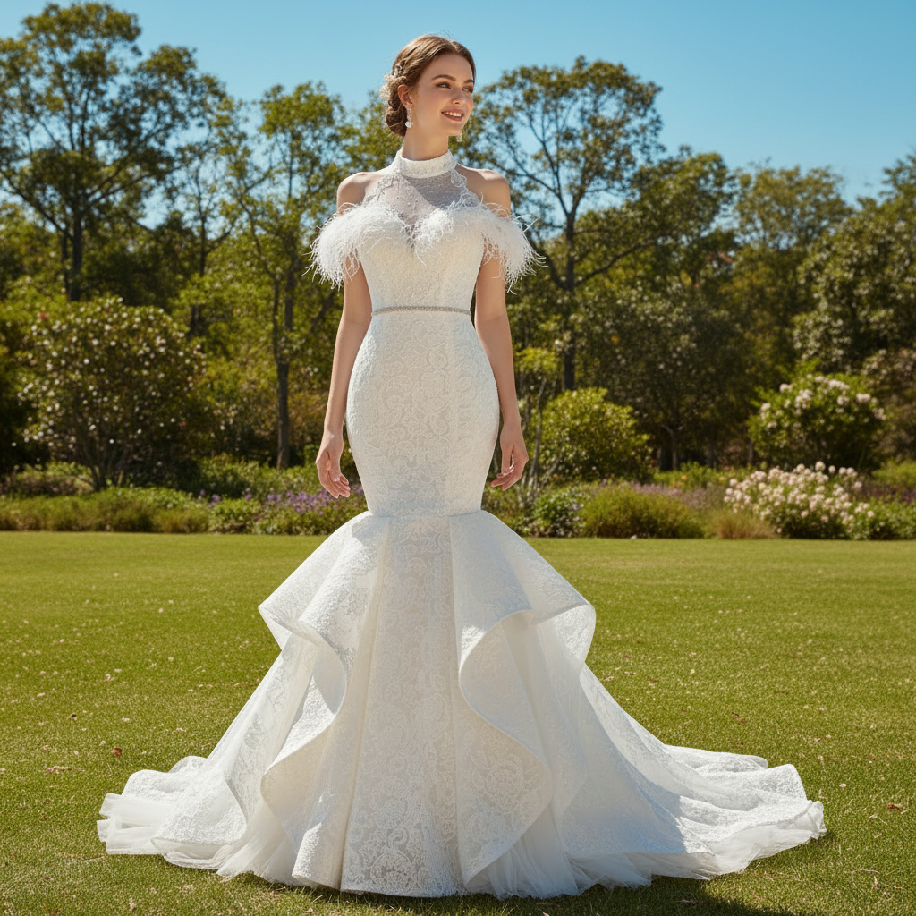 High Neck Elegant Luxury Trumpet Wedding Dress with Feather