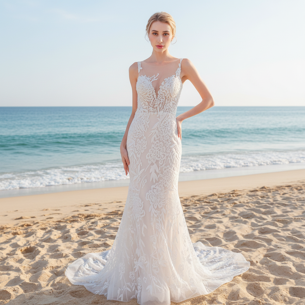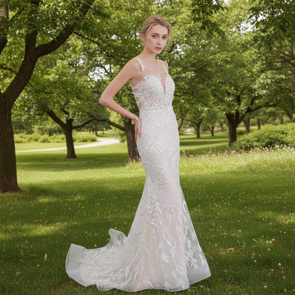 Sleeveless Illusion Neckline Sheer Lace Mermaid Wedding Dress