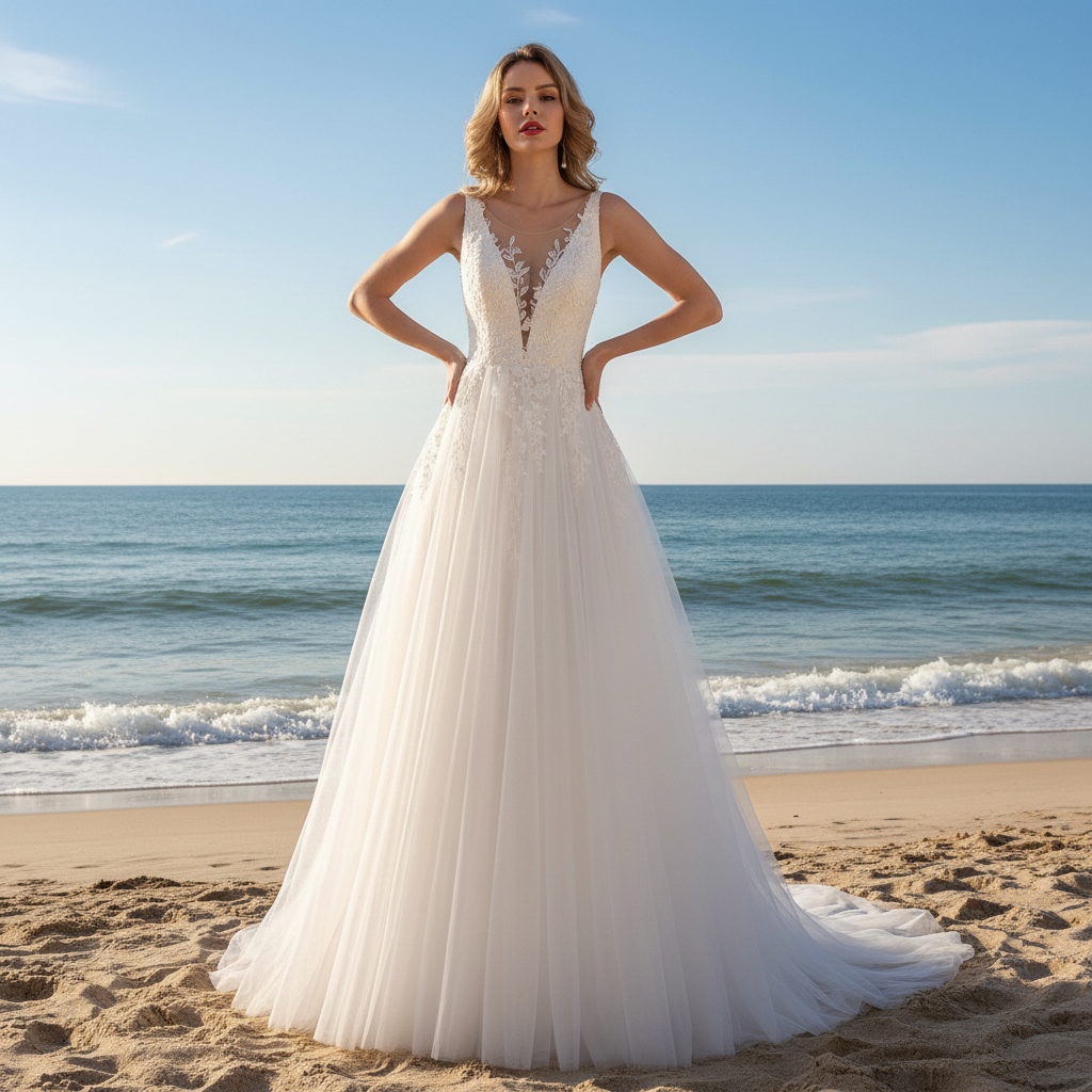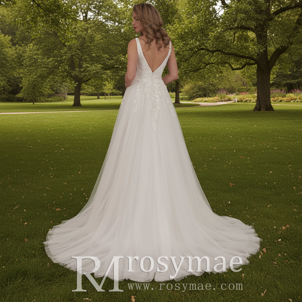 This stunning wedding dress features delicate tulle applique lace and a flattering plunging v-neckline. The tank top provides additional coverage and support, while the low back adds a touch of sexiness. Perfect for a romantic A-line silhouette that will make any bride feel like a princess on her special day.
