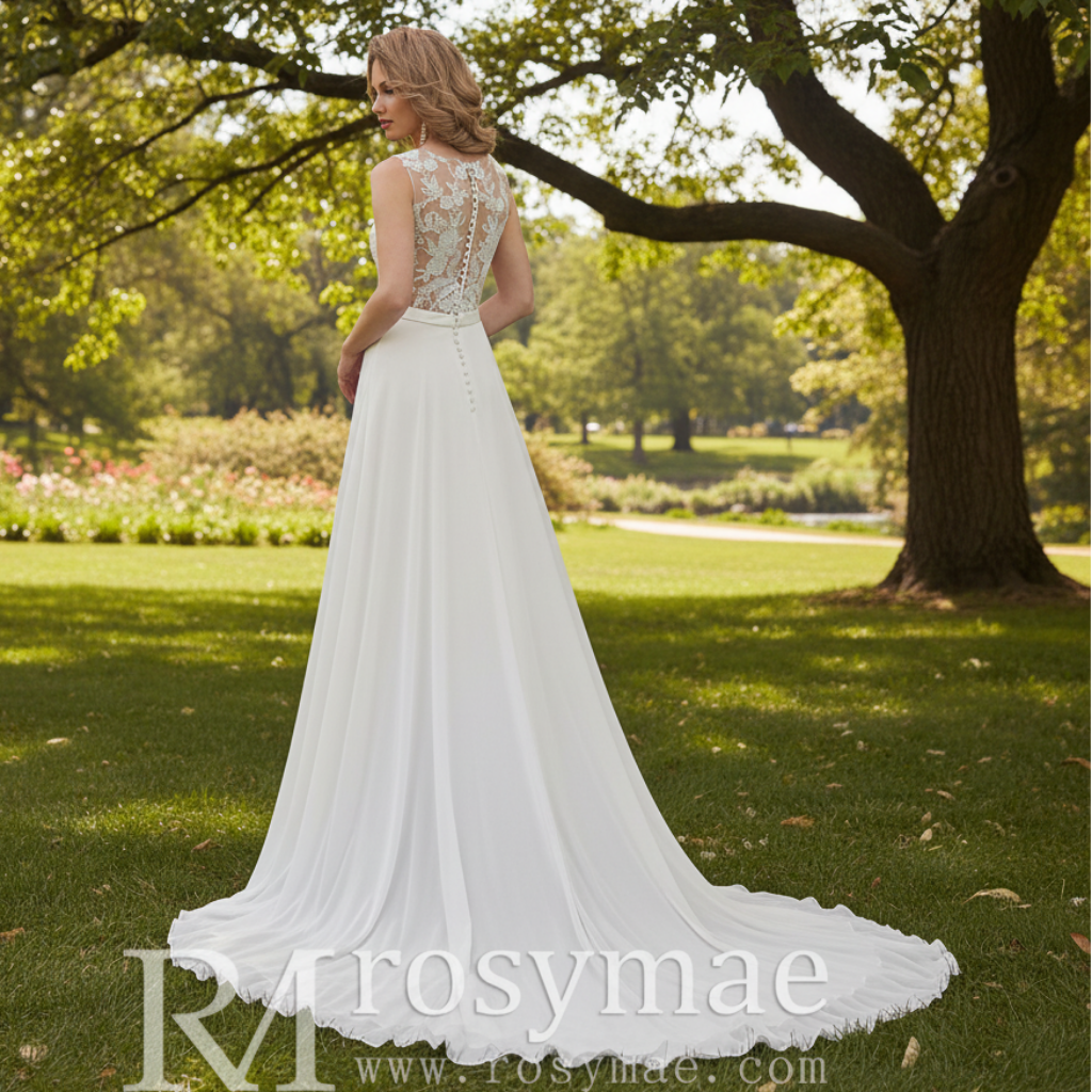 V-neck Satin and Chiffon A-line Wedding Dress with Sheer Back Elevate your bridal vision with this exquisite a-line wedding dress, meticulously crafted from premium satin and flowing chiffon. The sophisticated v-neckline draws the eye downward, creating an elongating silhouette that flatters every frame. Tank sleeves adorned with delicate floral lace and intricate beading provide refined detail and modest coverage, while the sheer lace appliqué back creates an alluring focal point that photographs beautifully. The structured bodice transitions seamlessly into a graceful a-line skirt, offering both elegance and comfortable movement throughout your celebration. A concealed zipper accented with a line of pearl buttons ensures a polished finish and secure fit. The chapel-length train adds dramatic presence as you walk down the aisle, trailing gracefully behind you without overwhelming the overall silhouette. This dress balances classic bridal tradition with contemporary design, making it an ideal choice for the modern bride seeking timeless sophistication and refined femininity.