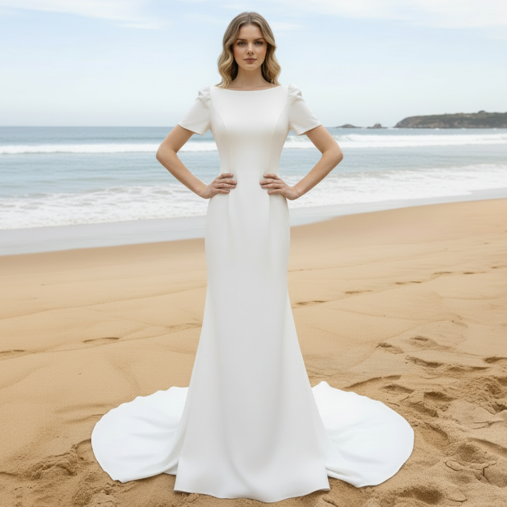 Capture the essence of timeless elegance with the Simple Mermaid Satin Wedding Dress featuring Short Sleeves, a gown designed to make your wedding day truly unforgettable. The sleek satin fabric glides over your body, perfectly contouring your silhouette with the sophisticated mermaid cut that enhances your natural curves while providing a refined, graceful shape. The soft short sleeves add a delicate romantic touch, offering just the right coverage for outdoor ceremonies or intimate beach weddings. This dress balances classic simplicity with subtle luxury—its lustrous satin reflects light beautifully, creating a radiant glow as you move. Inspired by the tranquil beauty of the sea, the design evokes a sense of serene charm and effortless sophistication. Whether you’re exchanging vows on the shore or celebrating under an open sky, this gown promises to highlight your natural beauty with poise and confidence. Choose a dress that not only reflects your style but also tells your unique love story, allowing you to create magical memories that will last a lifetime.