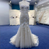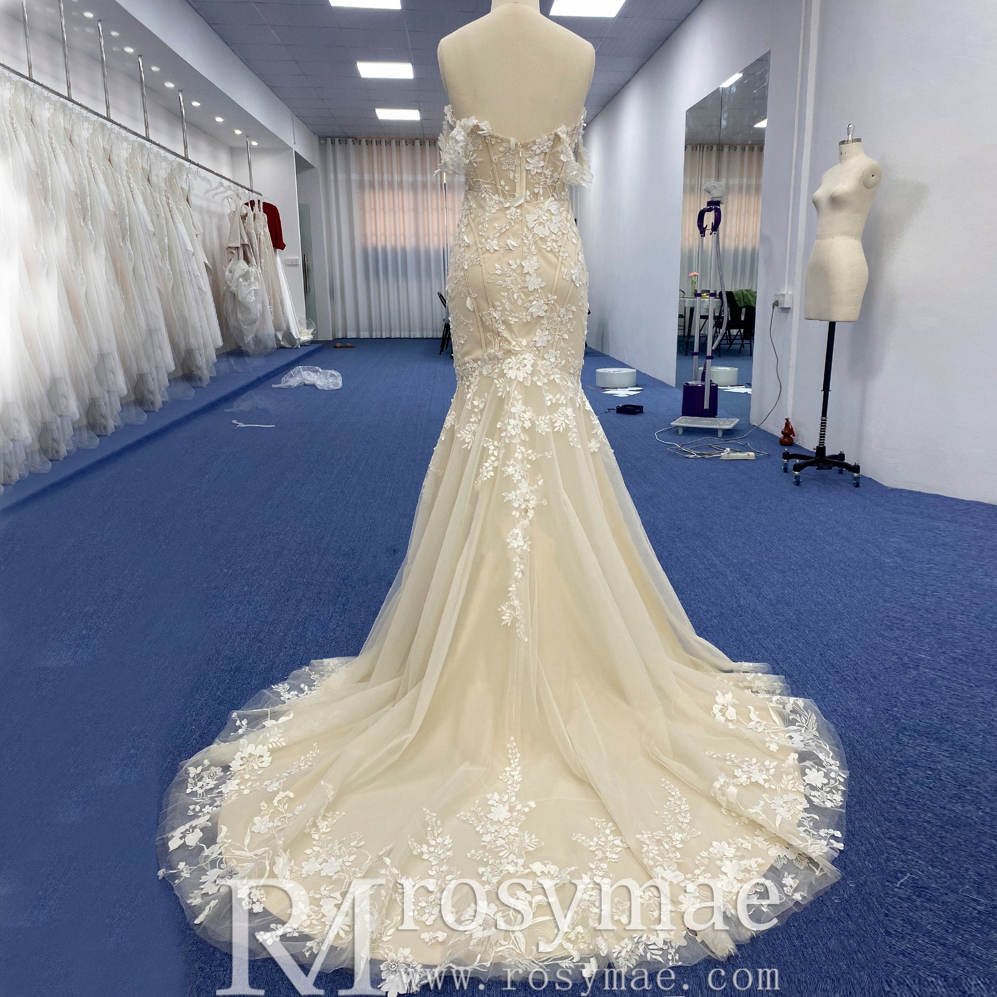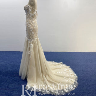 Handmade princess sweetheart mermaid wedding dress that hugs and flatters your curves, while the off-the-shoulder neckline adds a touch of romance. The low back and champagne color make for a stunning and unique look. Walk down the aisle with confidence and grace in this exquisite gown with a chapel train.