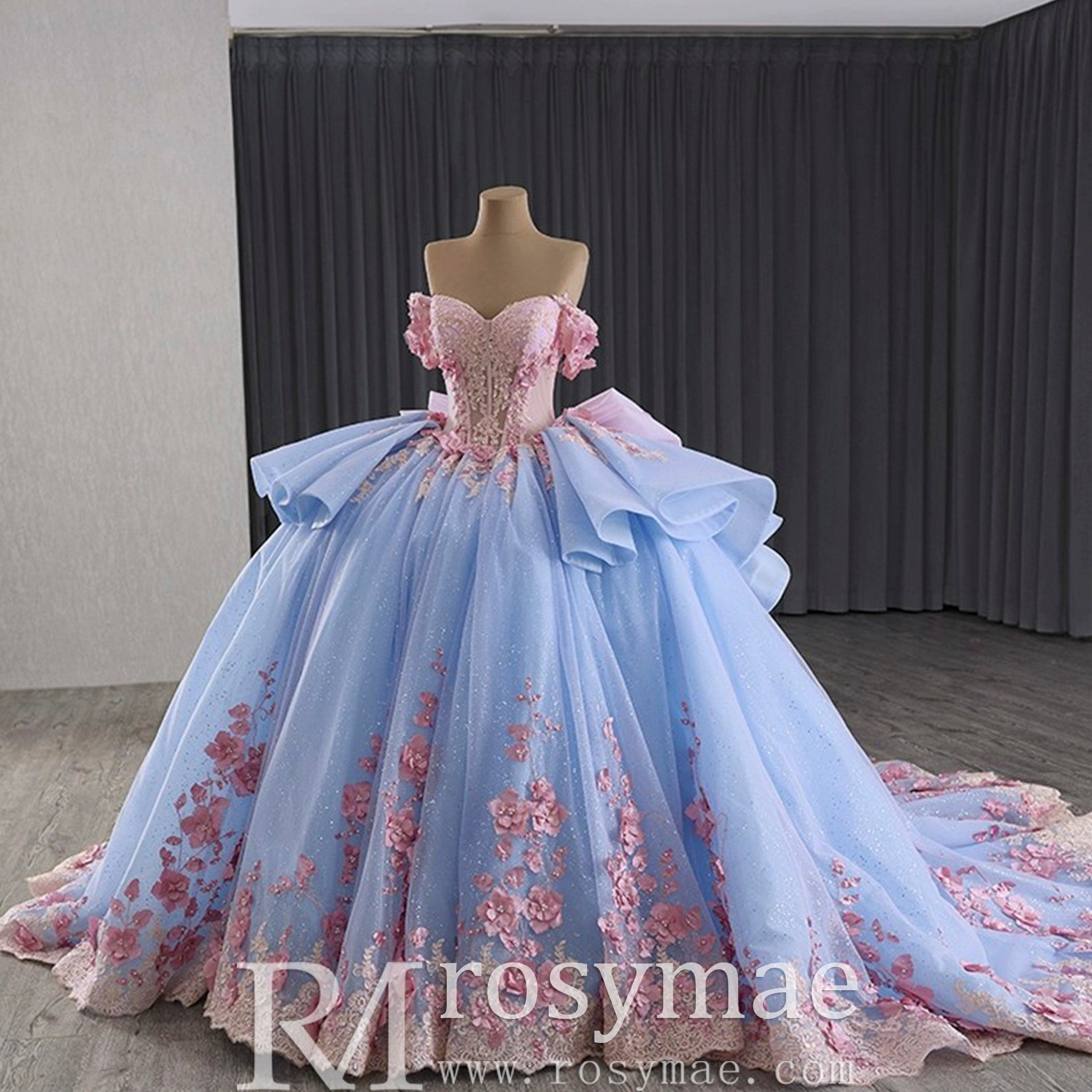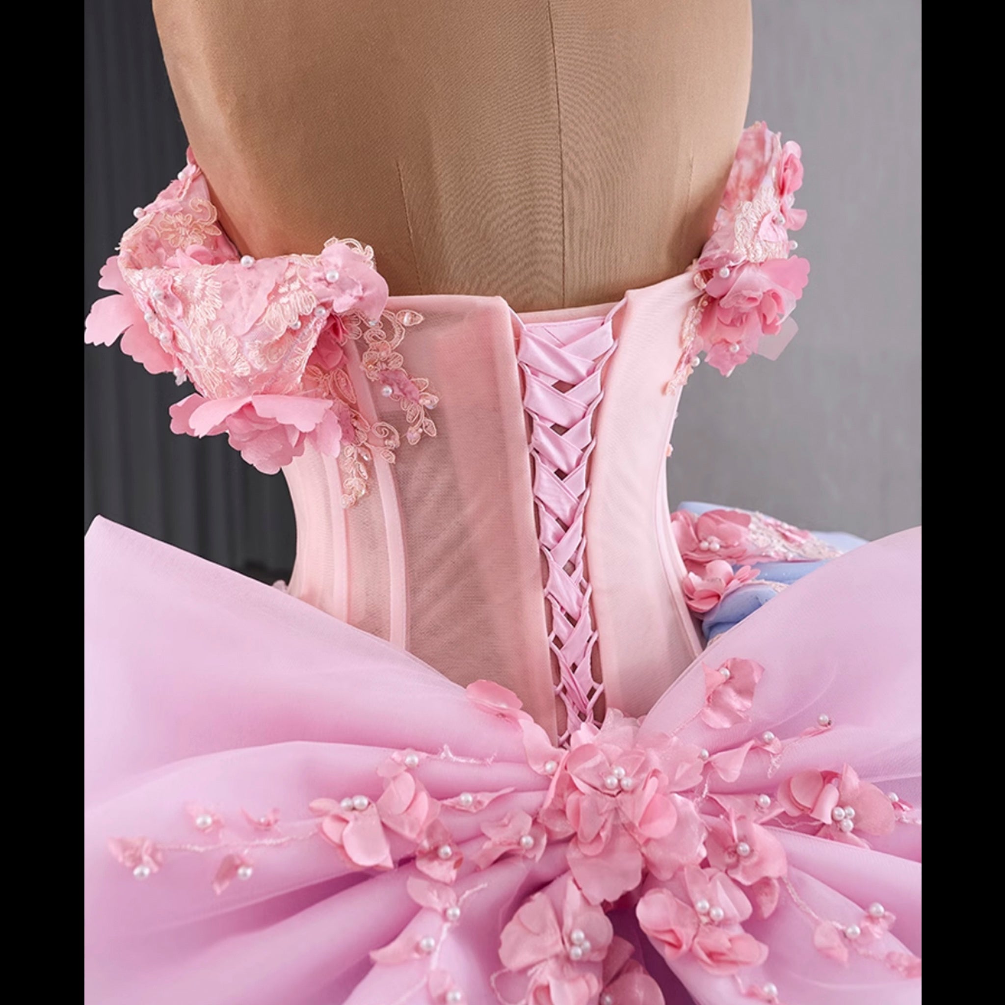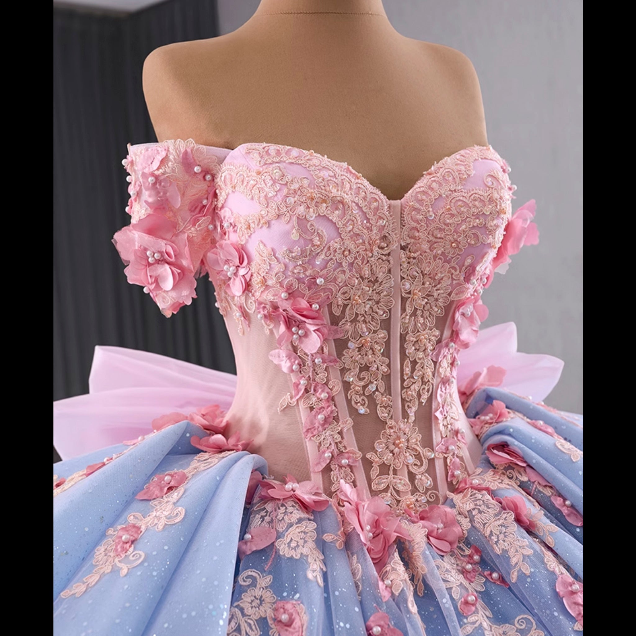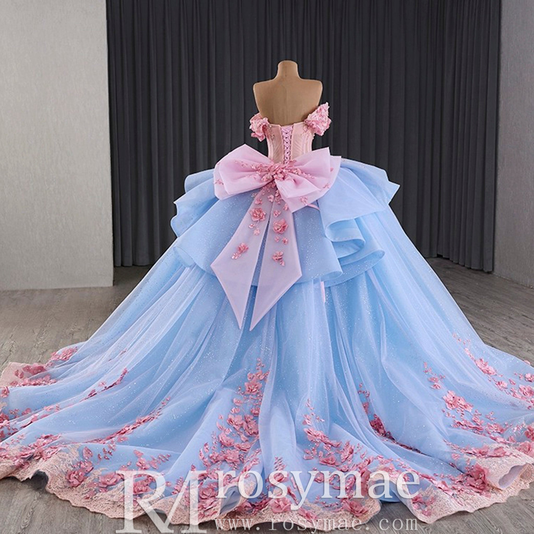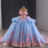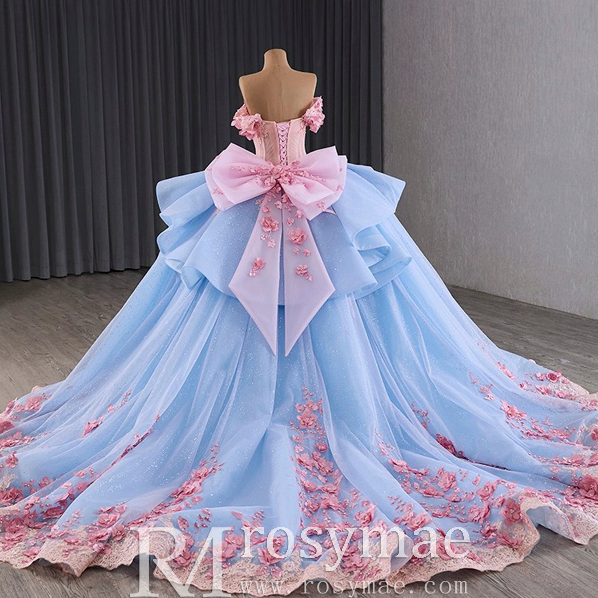 Celebrate your special day in this exquisitely handmade quinceanera dress, where exceptional craftsmanship meets enchanting design. The elegant off-the-shoulder neckline gracefully frames the collarbone, while the dramatic ruffle skirt creates beautiful movement with every step. A striking combination of soft blue and vibrant pink hues creates a captivating color contrast, enhanced by the sophisticated lace-up back that ensures a perfect fit. The delicate bowknot detail at the back adds a final touch of elegance, making this dress perfect for making a memorable statement at your quinceanera celebration.