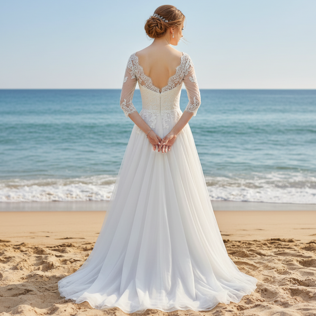 This 3/4 sleeve a-line wedding dress is perfect for your special day. The v-neck cut is flattering and elegant, while the tulle skirt gives the dress unique texture and movement. Show off your style on the big day with this timeless dress.