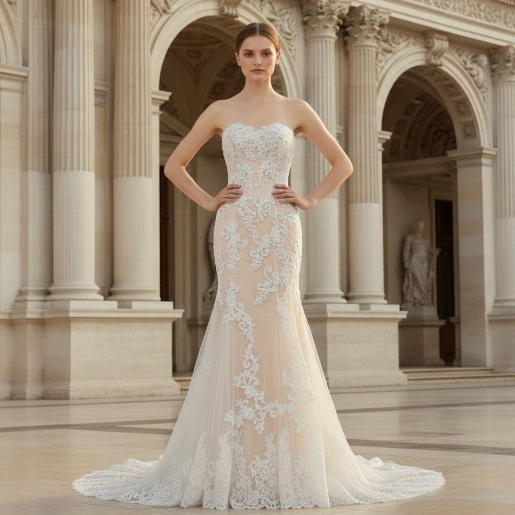 This gorgeous mermaid wedding dress features a stunning champagne color and super flattering lace design. The elegant mermaid silhouette highlights curves while the lace adds a touch of romance. Perfect for a bride who wants to feel sophisticated and beautiful on her special day.