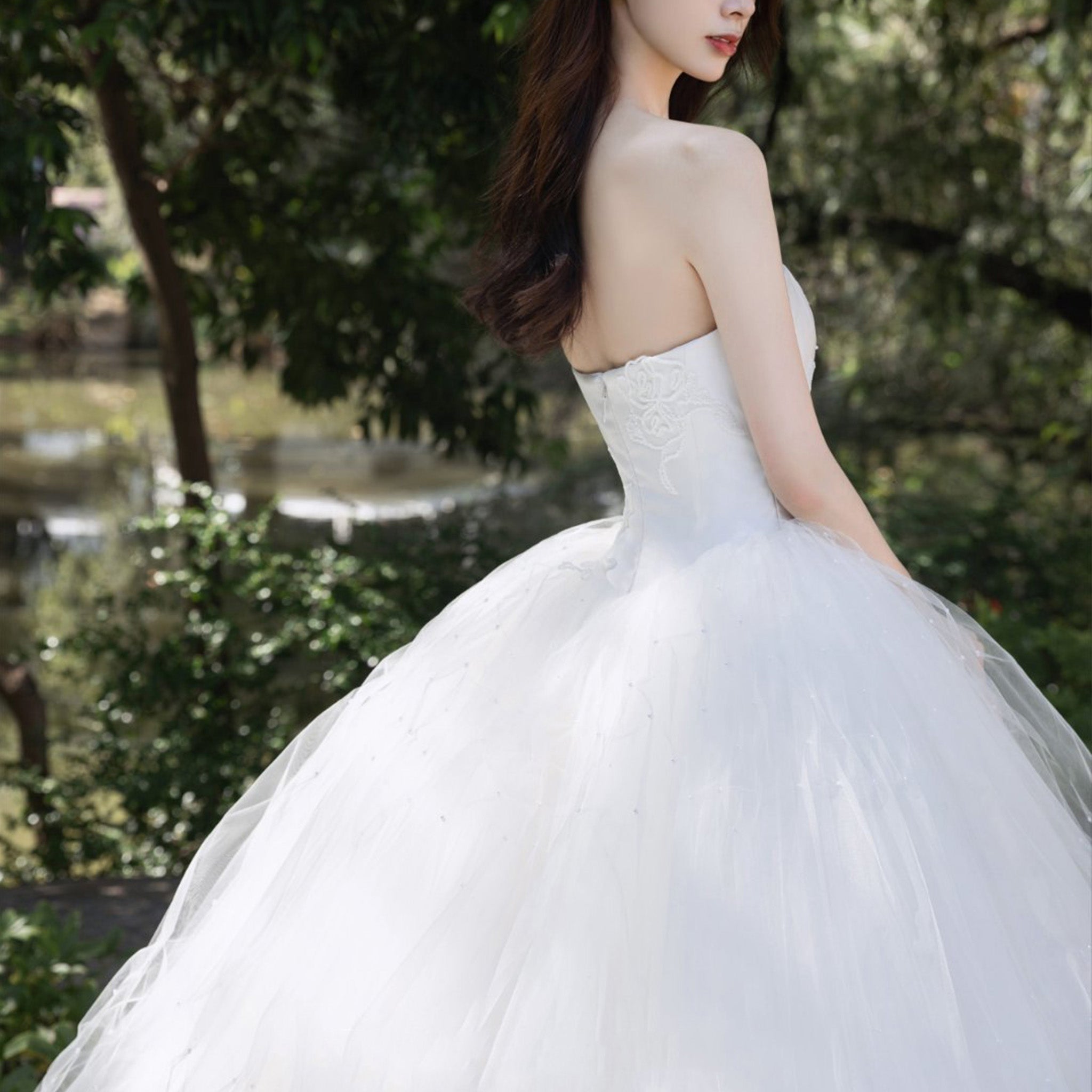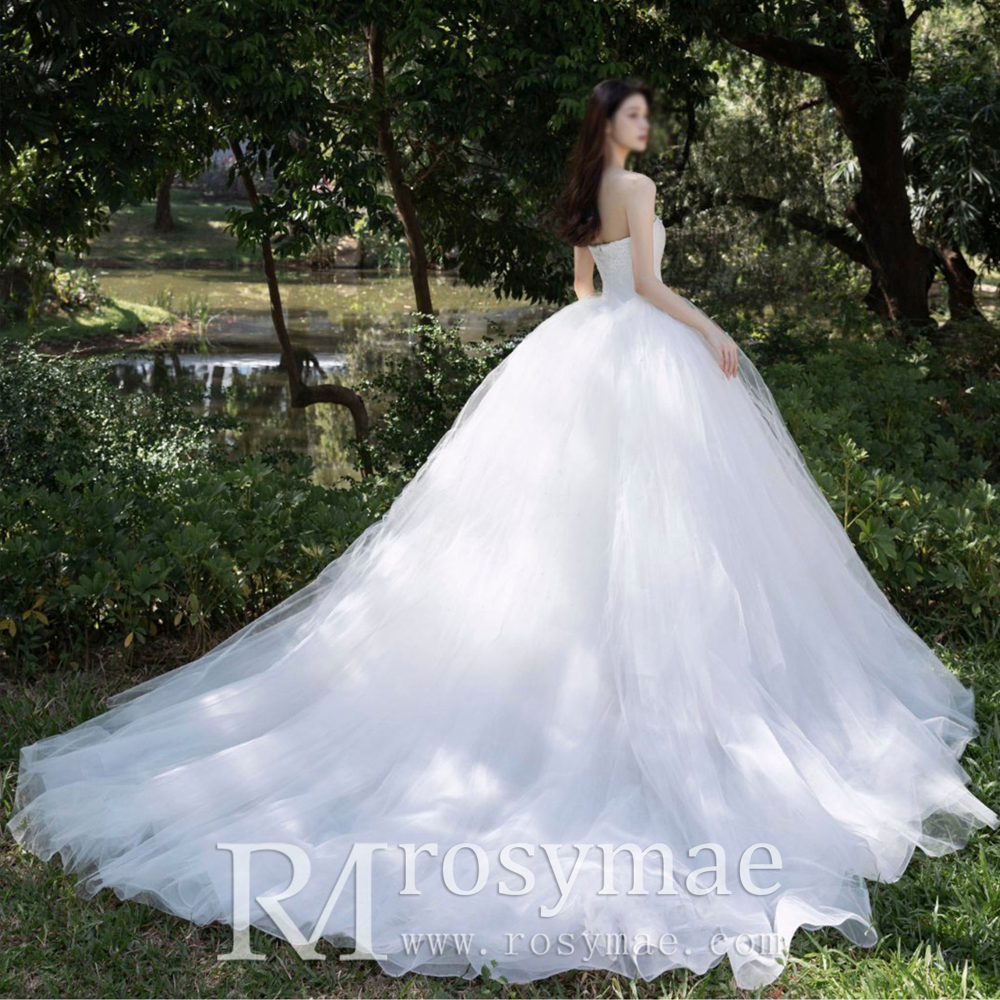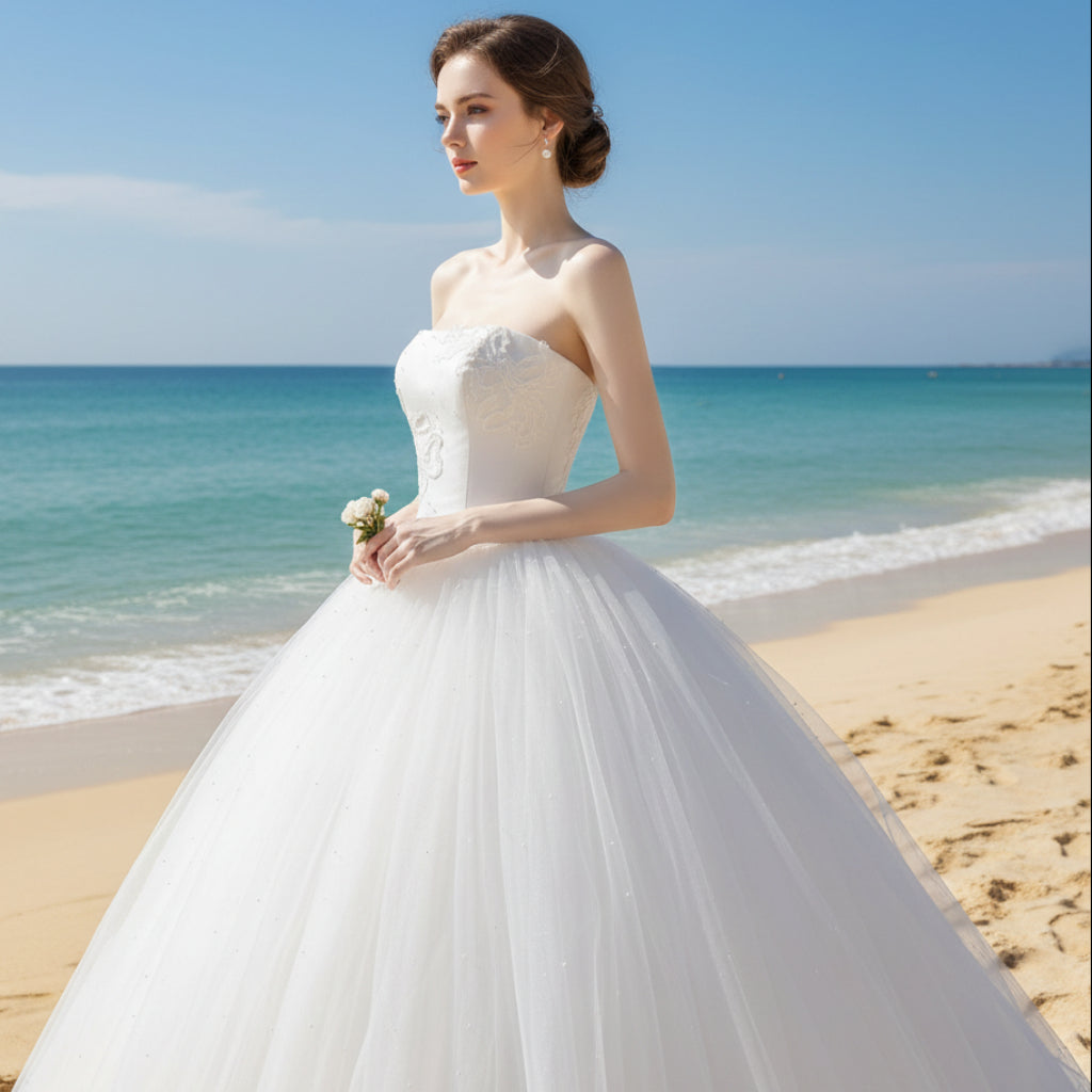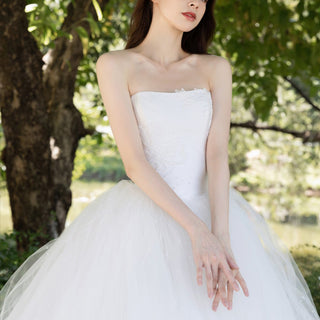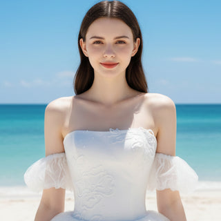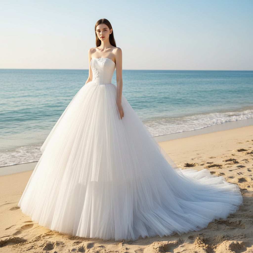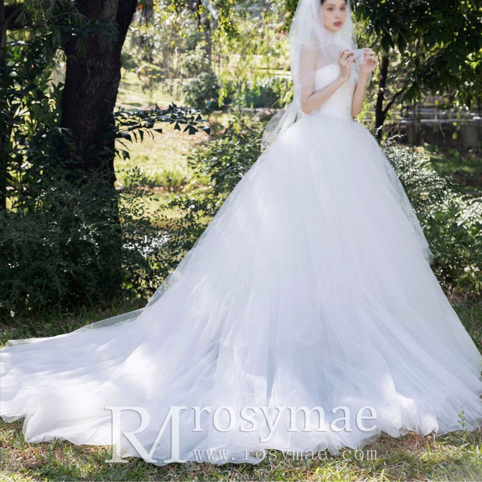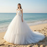 Expertly crafted for an outdoor or garden wedding, this stunning bridal gown features a timeless straight neckline and a multi-layer tulle skirt with a luxurious satin top. With its elegant design and exquisite materials, this dress is the perfect choice for any bride looking for a romantic and sophisticated look on her special day.