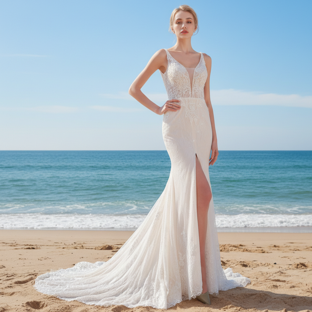 Expertly crafted for the discerning bride, this stunning mermaid wedding dress combines timeless silhouette with contemporary design elements. The tank top construction and backless design create an effortlessly sophisticated look, while the high side slit offers both movement and allure. The deep V-neck adds modern elegance and flatters the neckline beautifully. This dress is ideal for brides seeking to make a confident statement without compromising on classic bridal aesthetics. The mermaid cut hugs the body gracefully before flaring at the hem, creating a dramatic and flattering profile. Whether you're planning an intimate ceremony or a grand celebration, this gown delivers the perfect balance of bold design and refined elegance for your special day.