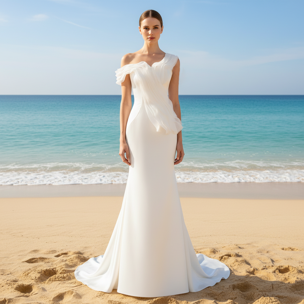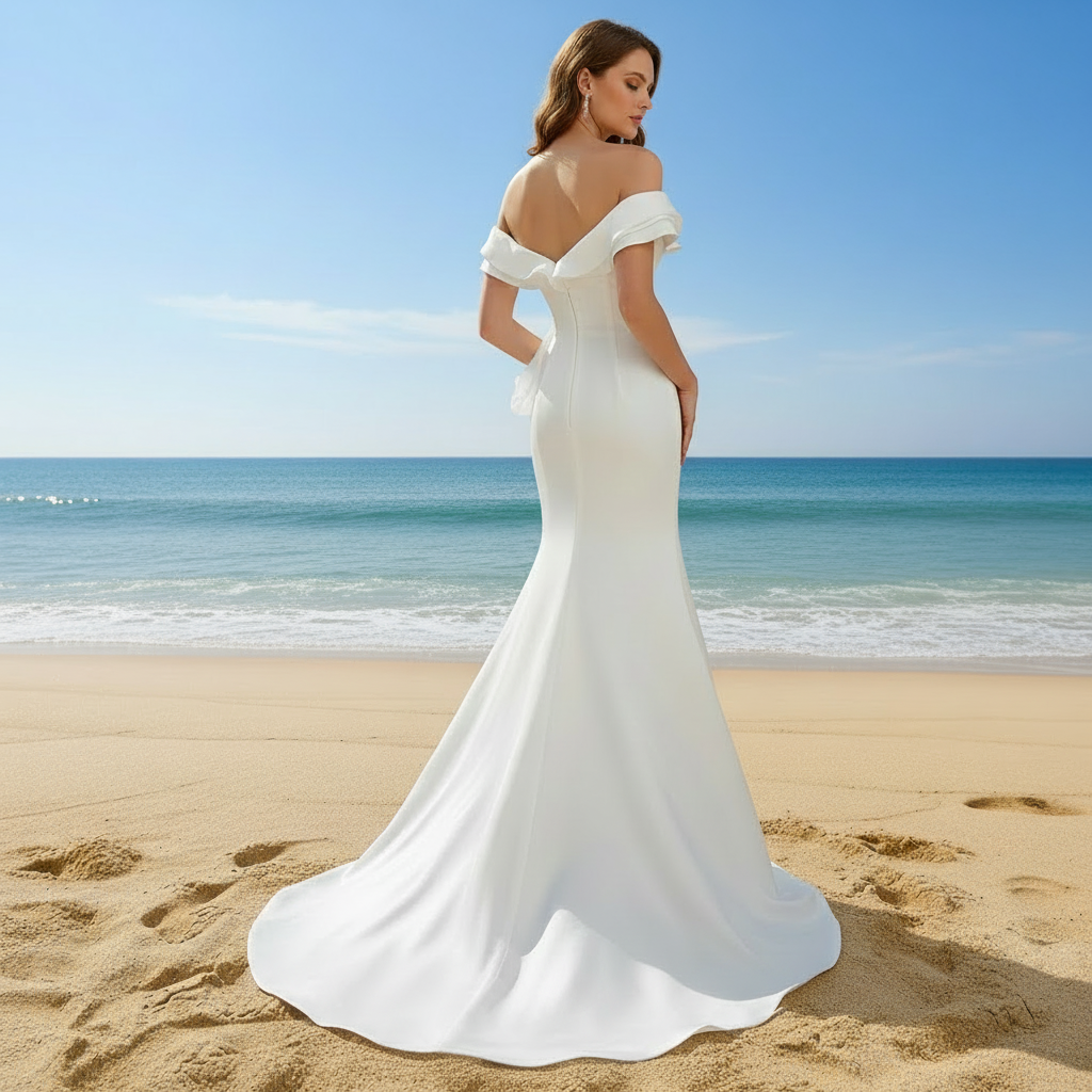 This elegant sleek simple mermaid wedding dress with ruffle sleeve redefines modern bridal sophistication with its graceful lines and thoughtful details, making it an exceptional choice for your wedding day. The delicate off-shoulder sleeves feature charming ruffle embellishments that infuse a romantic and feminine touch, seamlessly blending simplicity with refined elegance. The mermaid silhouette hugs your curves flawlessly, emphasizing your natural figure while creating a sleek, polished profile that commands attention with subtle confidence. Designed with both style and comfort in mind, this gown allows ease of movement and ensures you feel radiant and poised from your first step down the aisle through every moment of your celebration. Its distinctive fusion of classic shape with contemporary ruffle accents makes it an ideal selection for brides who desire a timeless yet daring look. Whether you're walking gracefully down the aisle or enjoying the evening’s festivities, this dress guarantees you will leave a lasting impression and make your wedding day truly unforgettable.