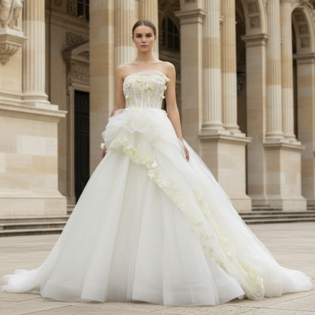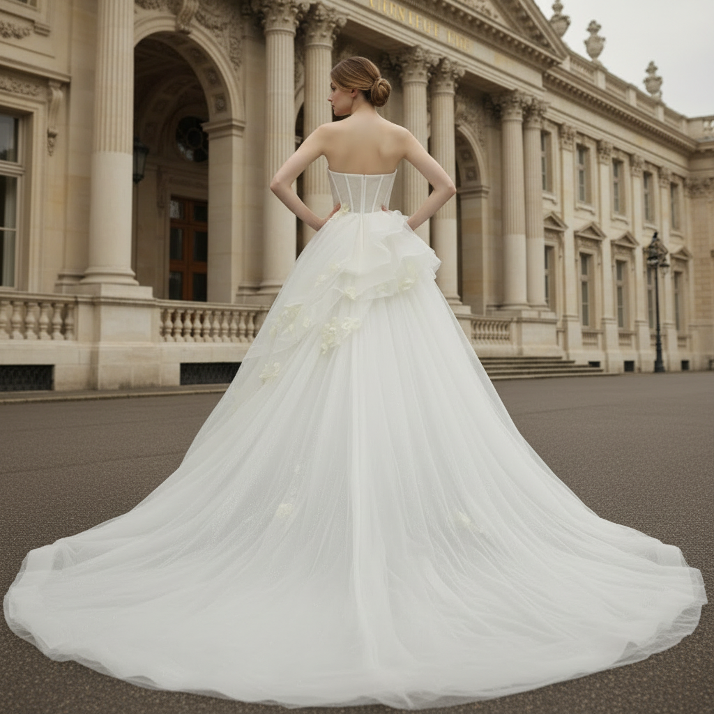 This stunning ballgown wedding dress boasts a strapless design embellished with colorful 3D flowers and layered ruffles. The luxurious tulle fabric sparkles with a touch of bling, while the court train adds volume and drama. Say "I do" in this exclusive bridal gown fit for a fairytale wedding.