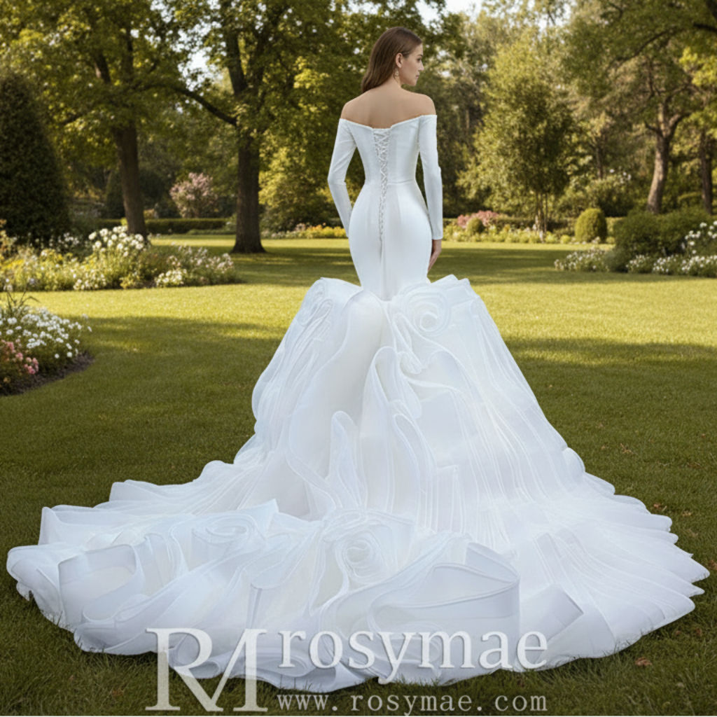 Embrace sublime sophistication in this exquisitely handmade organza wedding dress, where timeless craftsmanship meets contemporary grace. Designed for the discerning bride, this breathtaking off-the-shoulder gown features elegantly tailored long sleeves that cascade into delicate gathers at the wrists, creating an elongated silhouette of refined modesty. The luxurious organza fabric, carefully selected for its structural integrity and ethereal drape, forms a magnificent mermaid silhouette that celebrates feminine curves while maintaining an air of regal sophistication.