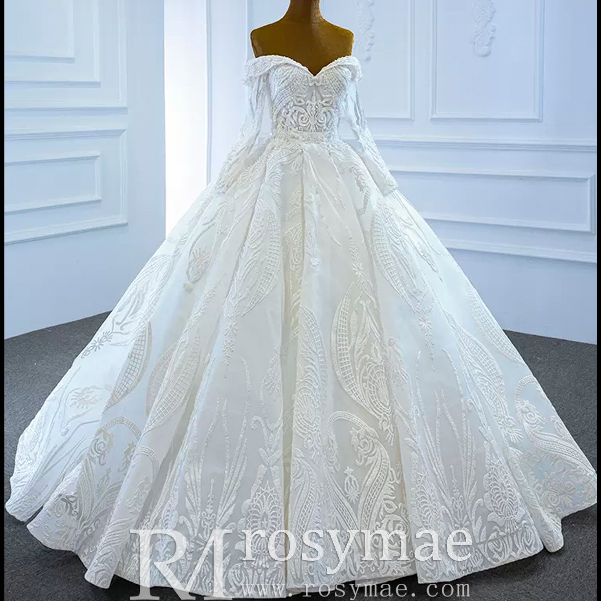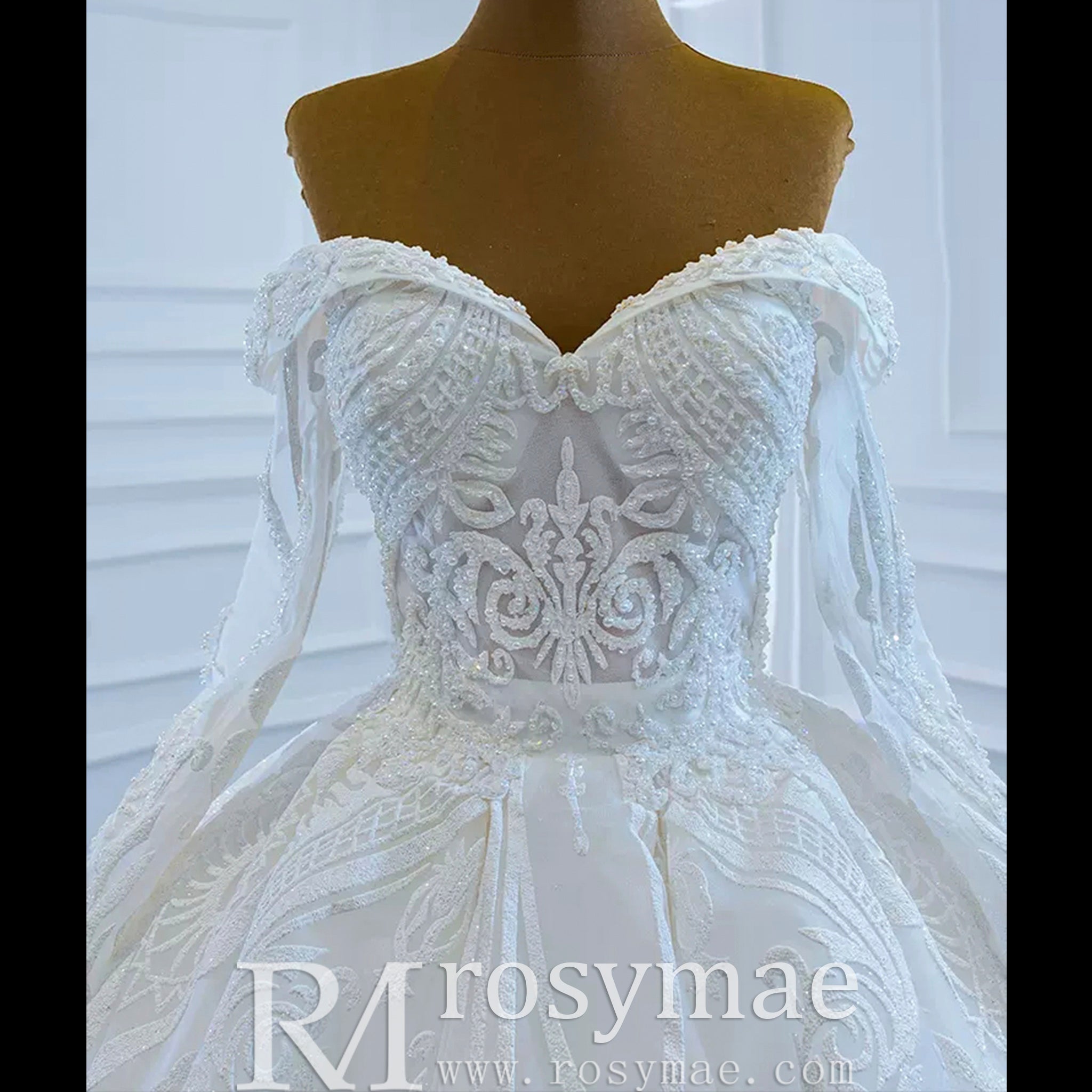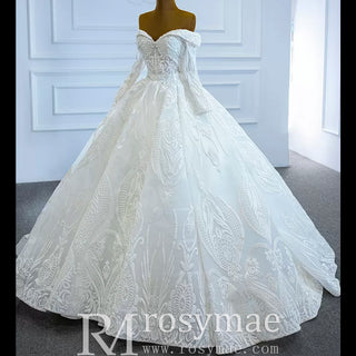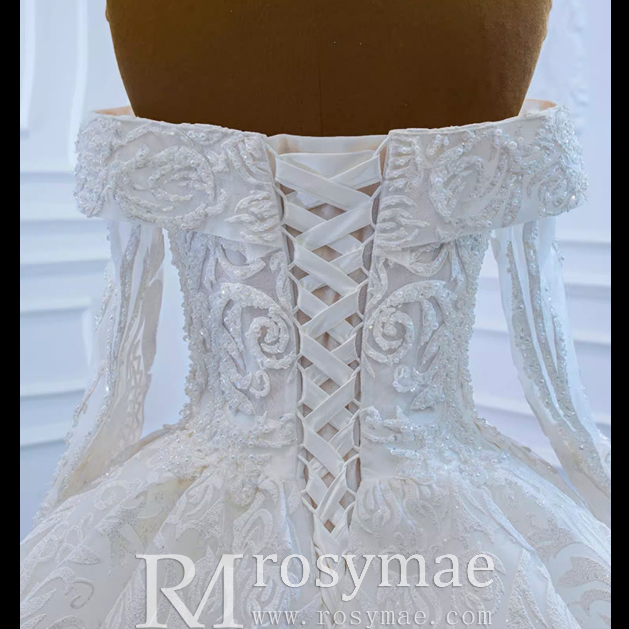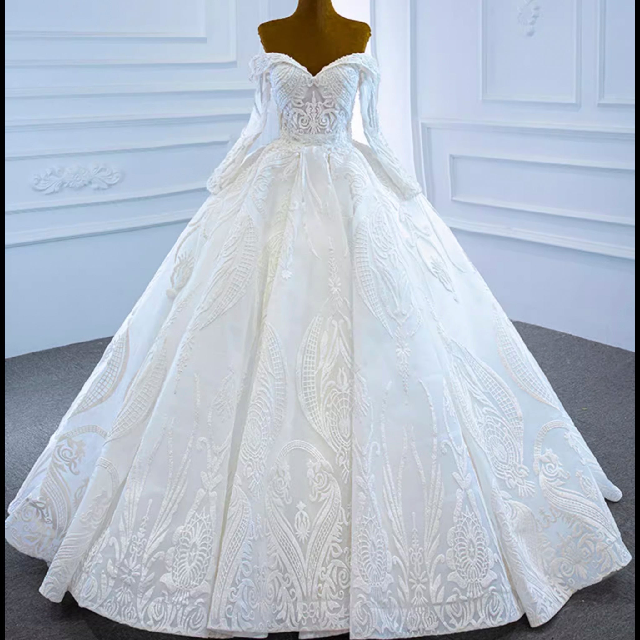 Embrace timeless sophistication in this exquisite handmade ball gown, where vintage inspiration meets modern luxury. This stunning dress features a graceful off-the-shoulder neckline, delicately framed with intricate lace that extends into elegant long sleeves adorned with opulent beadwork. The bodice is a masterpiece of craftsmanship, showcasing delicate floral lace appliqués and shimmering beadwork that catches the light with every movement.