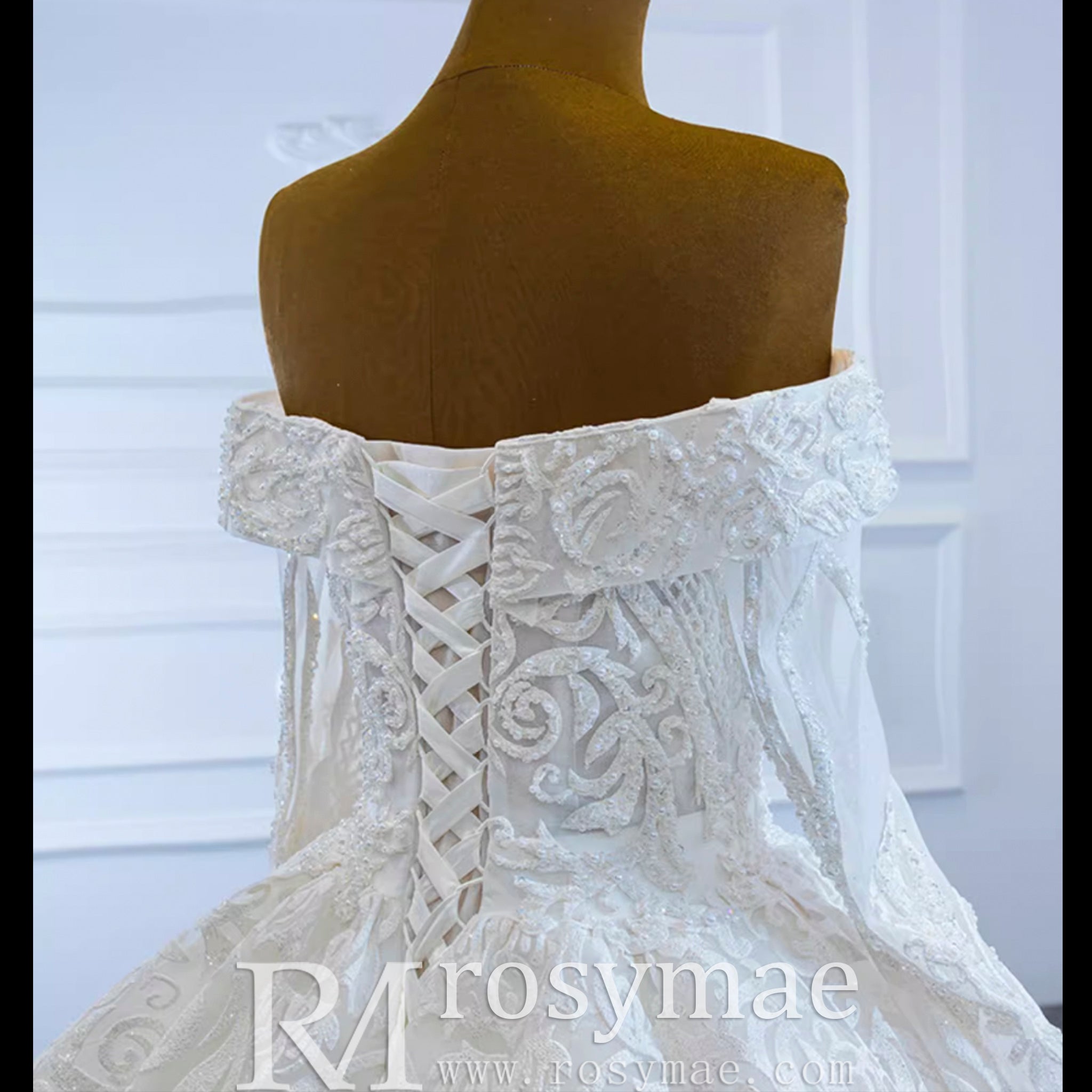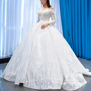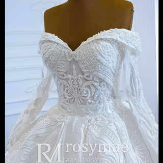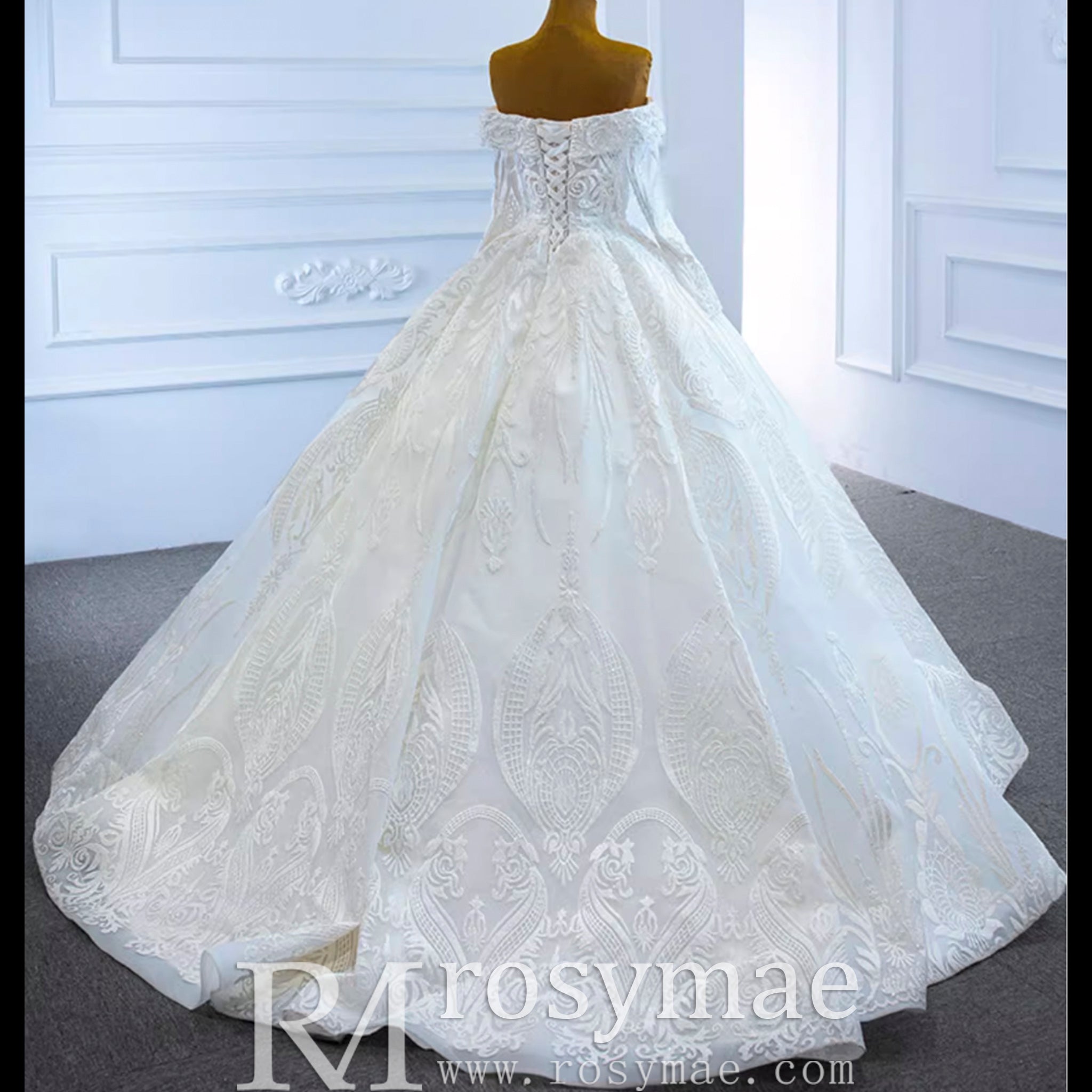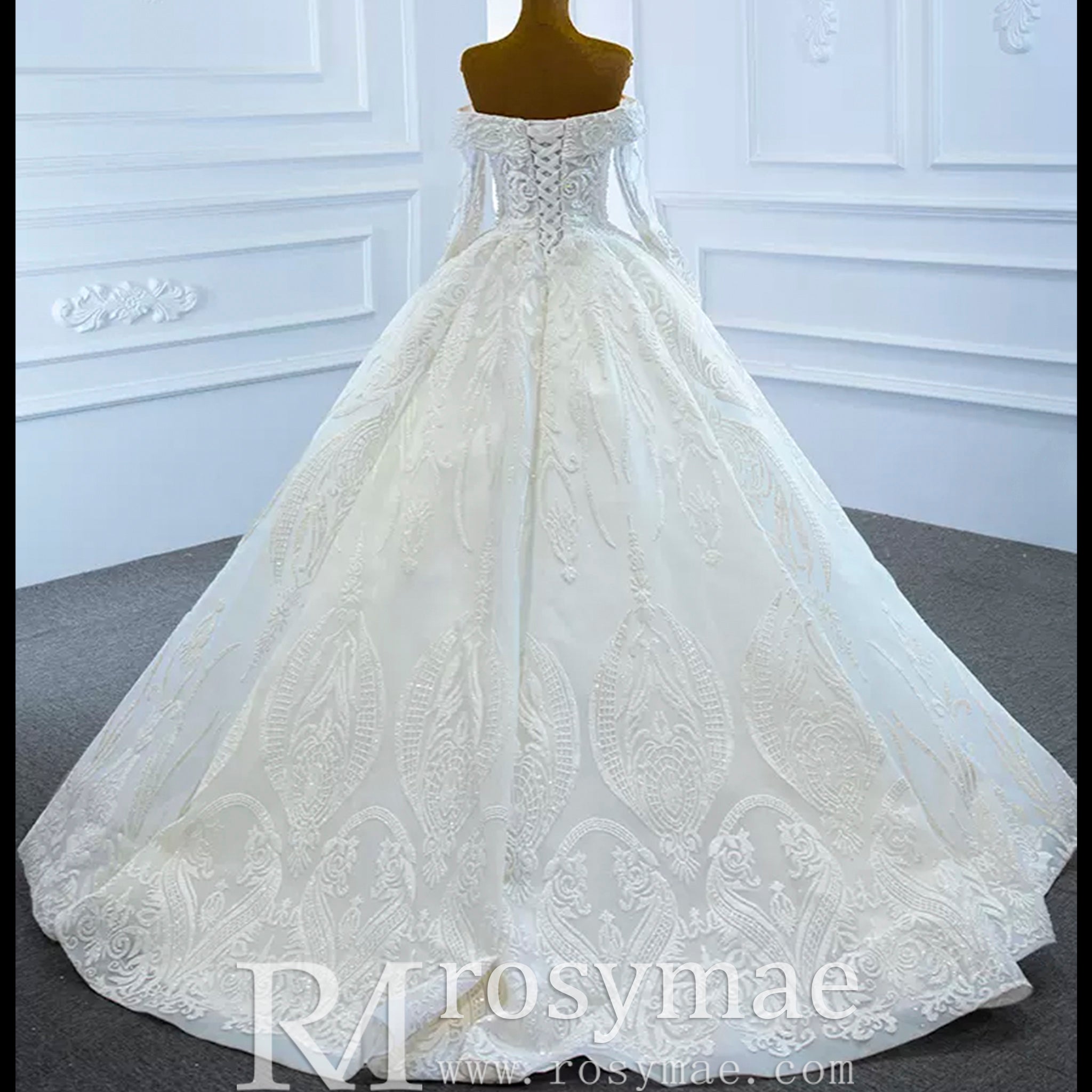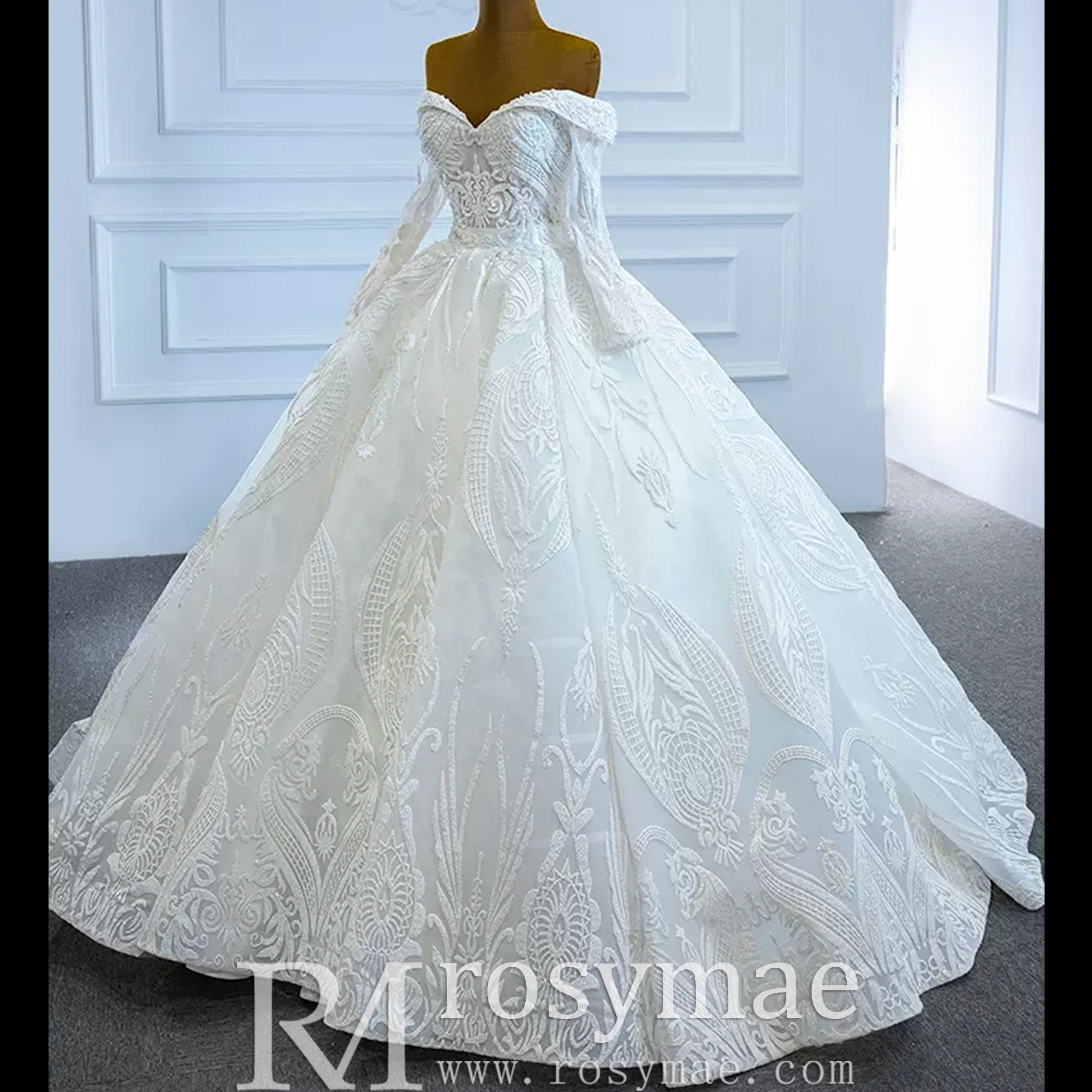 Embrace timeless sophistication in this exquisite handmade ball gown, where vintage inspiration meets modern luxury. This stunning dress features a graceful off-the-shoulder neckline, delicately framed with intricate lace that extends into elegant long sleeves adorned with opulent beadwork. The bodice is a masterpiece of craftsmanship, showcasing delicate floral lace appliqués and shimmering beadwork that catches the light with every movement.