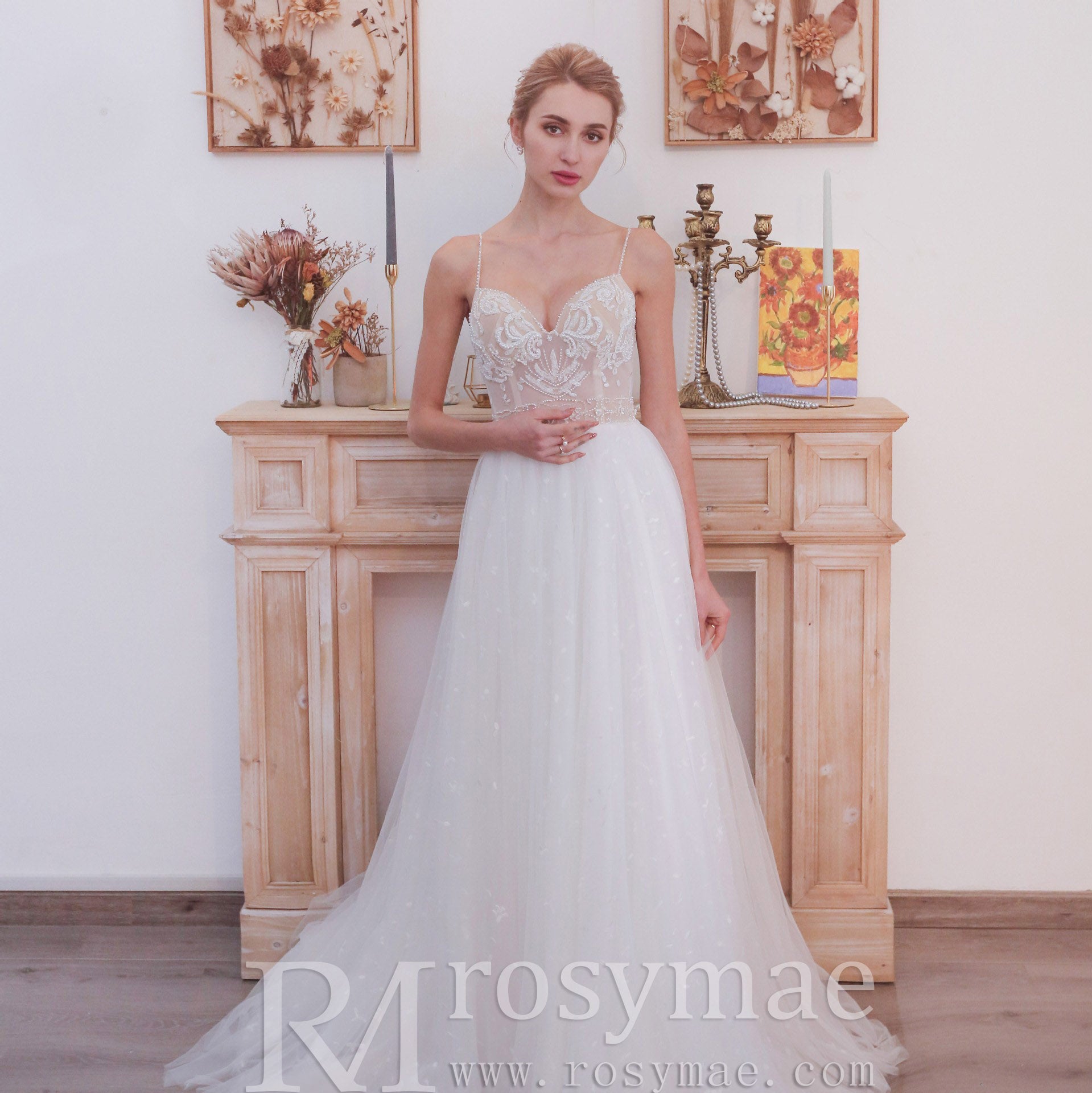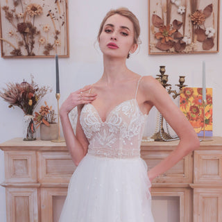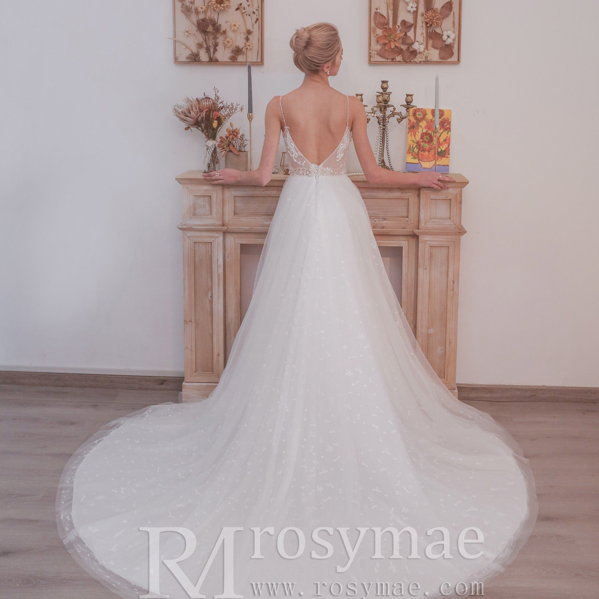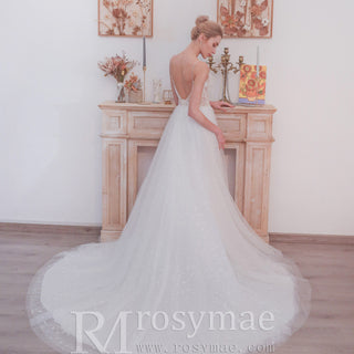 Romantic mermaid wedding dress with backless,floral lace decorates the bodice, featuring beaded spaghetti straps and a flattering sweetheart neckline, layers of misty tulle features soft-flowing A-line skirt that is easy to move in, gorgeous low V-back, this mermaid wedding dress is perfect for an outdoor wedding!