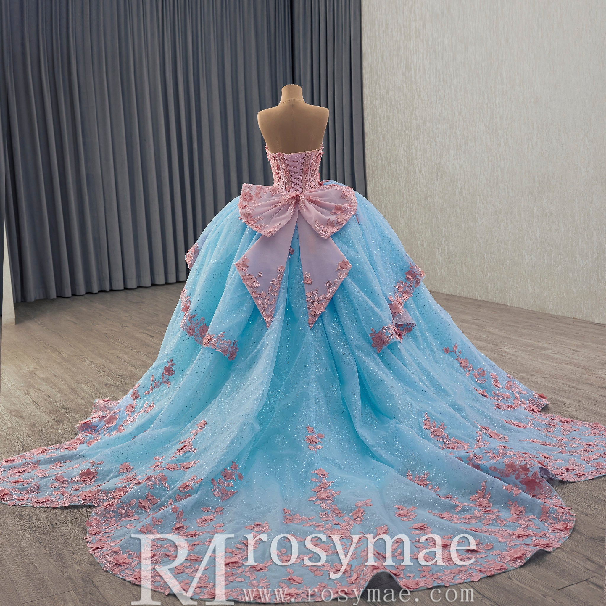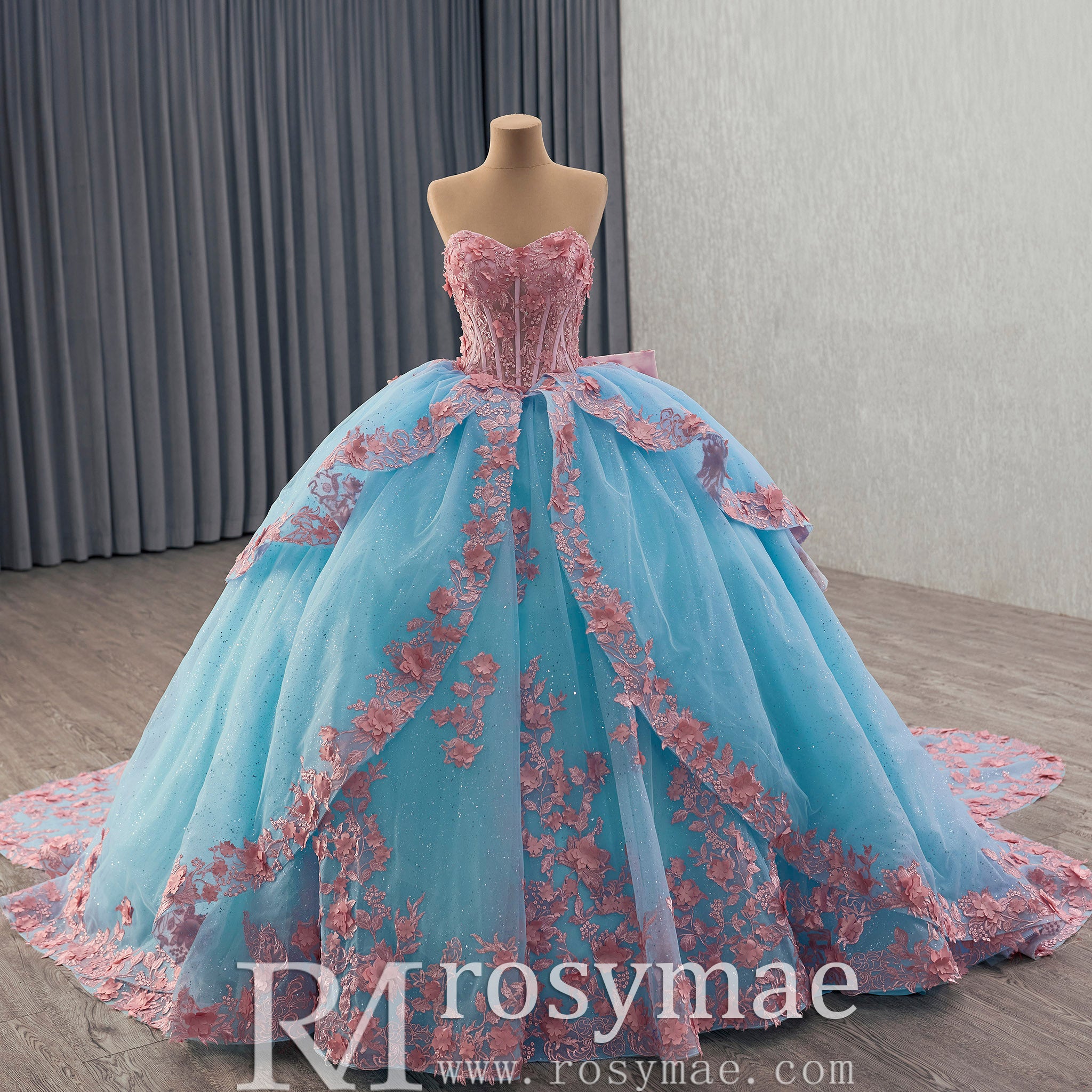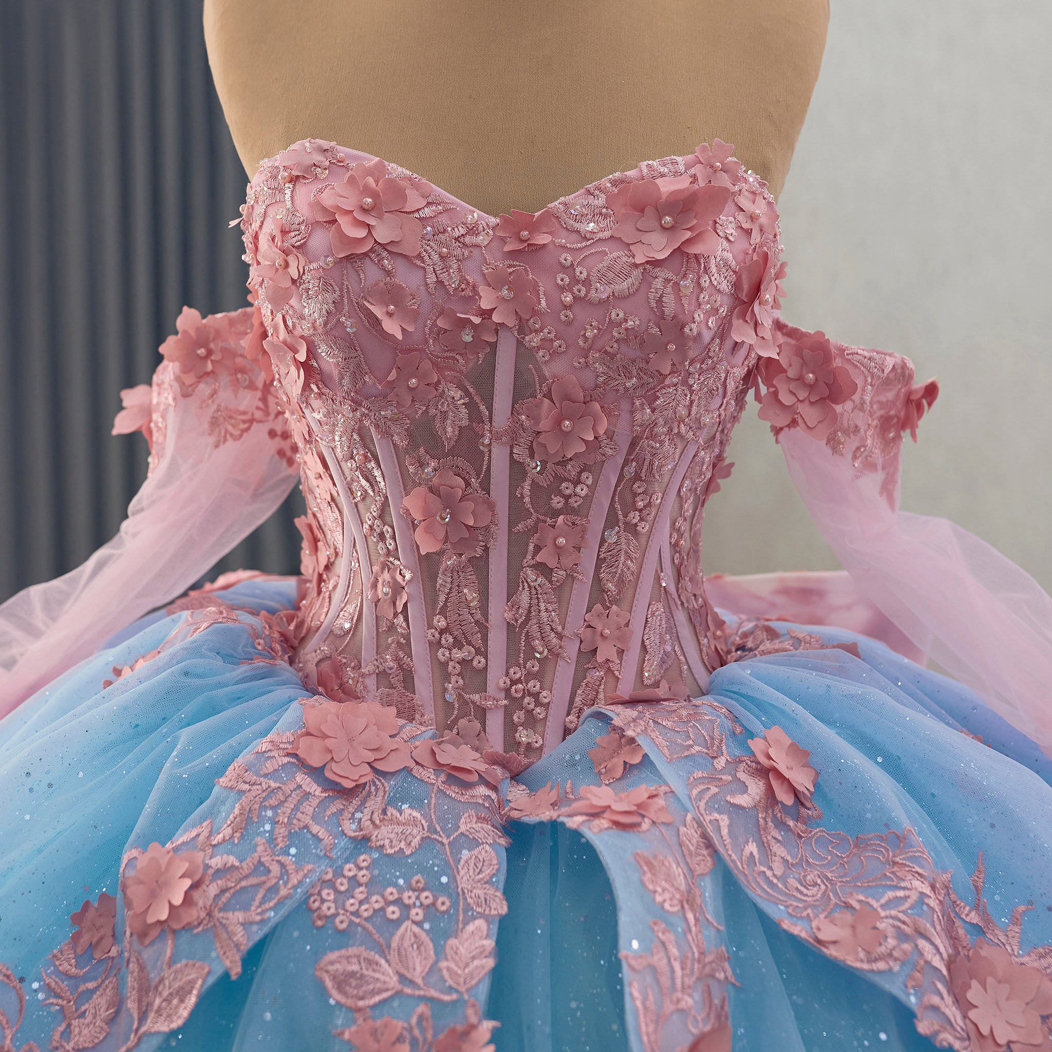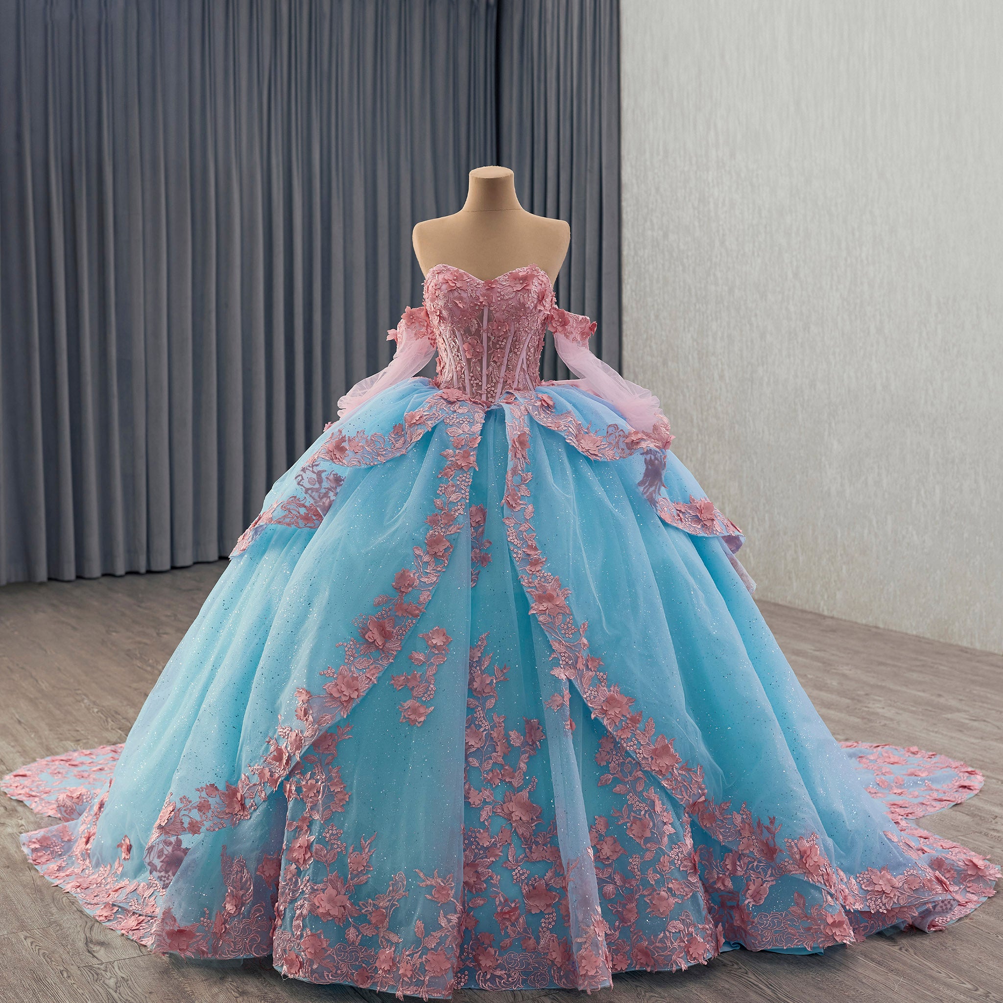 Celebrate your milestone moment in a dress designed for the girl who wants it all—versatility, elegance, and unforgettable style. This stunning teal and pink quinceanera gown offers the ultimate flexibility with its detachable long sleeves, allowing you to transition seamlessly from the formal ceremony to the dance floor without changing outfits. The exquisite pink floral appliqués bloom across the bodice like a garden in full bloom, while delicate beaded pearls catch the light with every graceful movement. These intricate embellishments showcase the craftsmanship and attention to detail that sets this dress apart from ordinary gowns. The sheer bodice creates an air of refined sophistication, perfectly balanced by the structured lace-up closure that cinches your Basque waistline for a flattering, hourglass silhouette. This design element not only enhances your natural beauty but also ensures a secure, comfortable fit throughout your celebration. The voluminous sparkling tulle skirt creates an enchanting silhouette that commands attention as you enter any room, while the graceful train adds drama and grandeur to your every step. Whether you're celebrating your quinceañera at 15 or sweet 16, this dress transforms you into the radiant center of attention. This is the dress for the girl who refuses to settle—one that adapts to your vision, flatters your figure, and makes you feel absolutely breathtaking on your most important day.