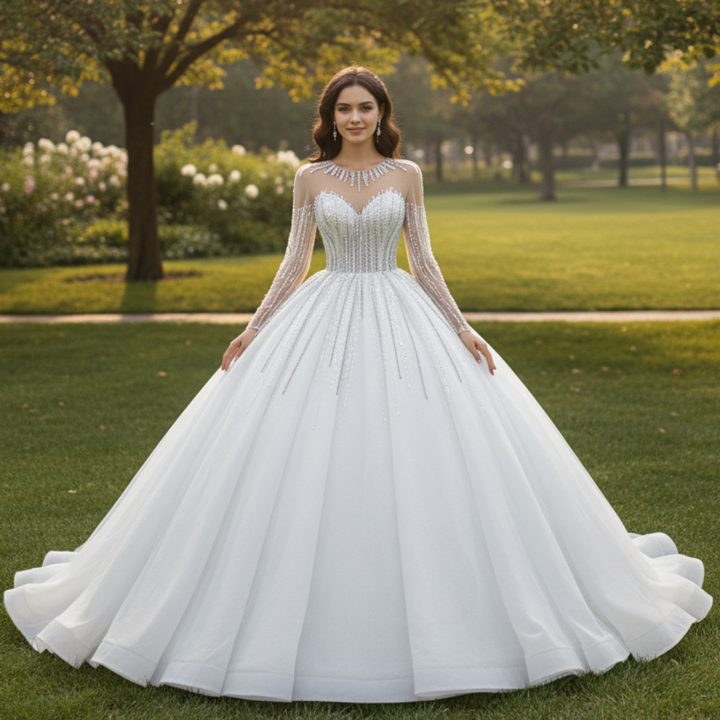 Crafted from layers of luxurious soft tulle, the voluminous skirt flows into a dramatic cathedral train, creating a romantic silhouette that moves with you like a whisper of elegance. The gown’s structured bodice, lined for comfort and support, is enhanced with subtle boning to accentuate your figure while honoring modest aesthetics. Ideal for traditional Arabic weddings or vintage-themed celebrations, this piece balances opulent detail with wearable artistry, ensuring you feel both empowered and ethereal on your special day.