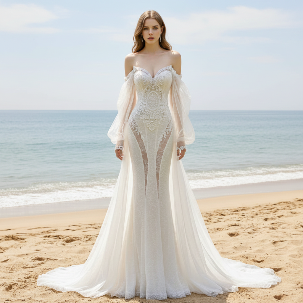 Turn heads with this on-trend mermaid bridal gown that combines contemporary style with timeless elegance. The distinctive lantern sleeves create a fashion-forward silhouette that sets you apart while providing graceful, flattering coverage. Delicate pearls are strategically placed throughout the gown, catching light beautifully and creating a luminous sparkle that photographs absolutely stunning. The fitted mermaid silhouette hugs your curves in all the right places before flowing into an elegant fishtail, creating a silhouette that celebrates your natural beauty and commands attention. The sheer skirt detailing adds an ethereal quality and romantic touch, balancing the gown's modern elements with timeless femininity. What truly elevates this dress is the ingenious detachable train—offering you complete flexibility to transition from a dramatic ceremony entrance to an elegant reception where you can move freely and celebrate without restriction. This is the ultimate choice for the fashion-conscious bride who wants to stay ahead of trends without sacrificing sophistication. Perfect for the modern woman who refuses to blend in—a gown that celebrates your individuality, style, and the magic of your special day with undeniable presence and unforgettable allure.