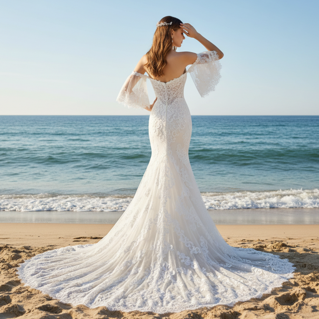 Look and feel like royalty in this chic mermaid lace wedding dress. This elegant bridal gown features a sweetheart neckline with flowy sleeves, beautiful floral lace all-covered, and is finished off with a light champagne color. Make your special day picture perfect and take their breath away!