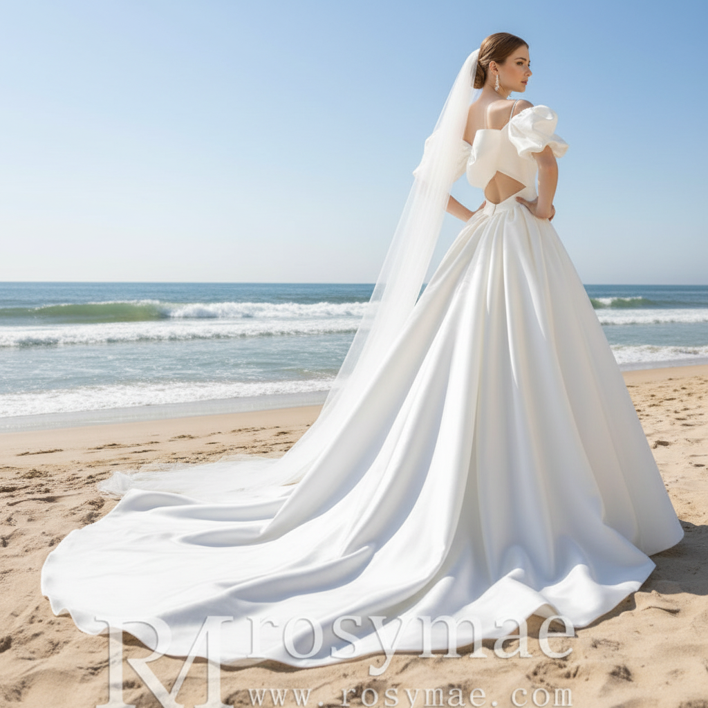 Off-shoulder ball gown wedding dress with puffy short sleeves and hidden spaghetti straps for added support and comfort. The ruched bodice flatters the figure while the A-line silhouette creates an elegant, timeless profile. A keyhole back detail with bowknot accent and cathedral train complete this romantic bridal look, perfect for traditional and modern ceremonies alike.