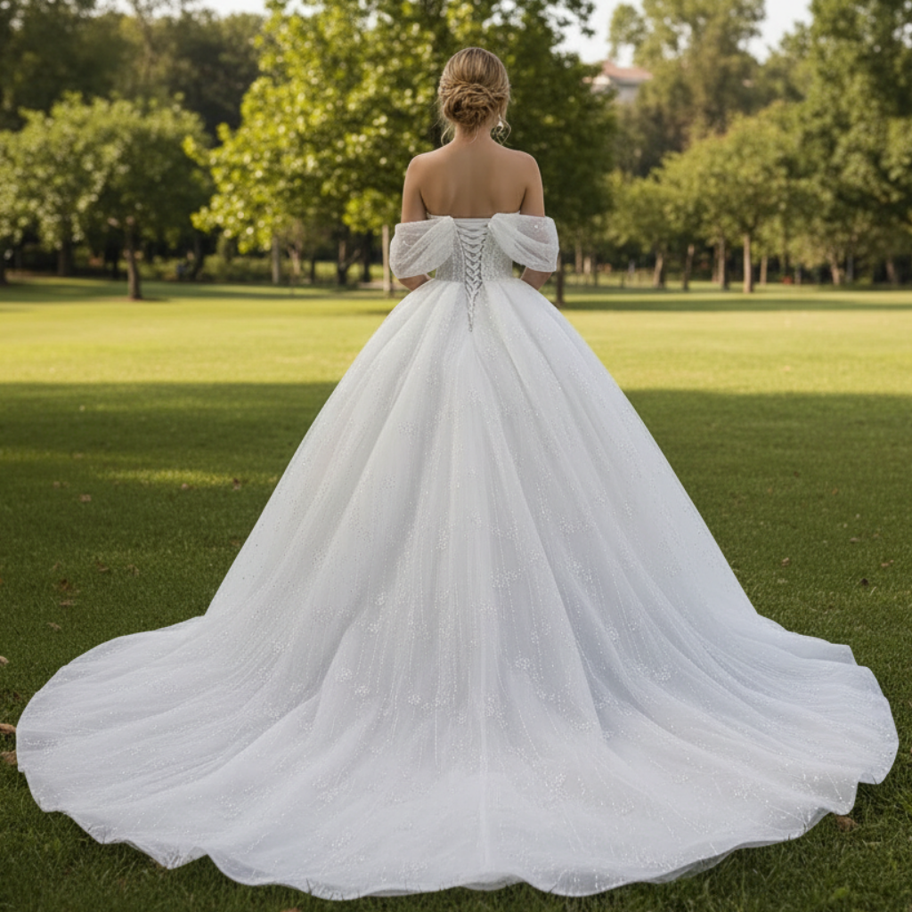 Sparkly Ball Gown Off the Shoulder Wedding Dress with Sheer Bodice