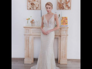 From the expertly crafted illusion neckline to the dazzling sequin details, this mermaid wedding dress is sure to make a statement. The deep V-neck and open back add a touch of drama, while the fit and flare design flatters your figure. Be the center of attention on your special day.