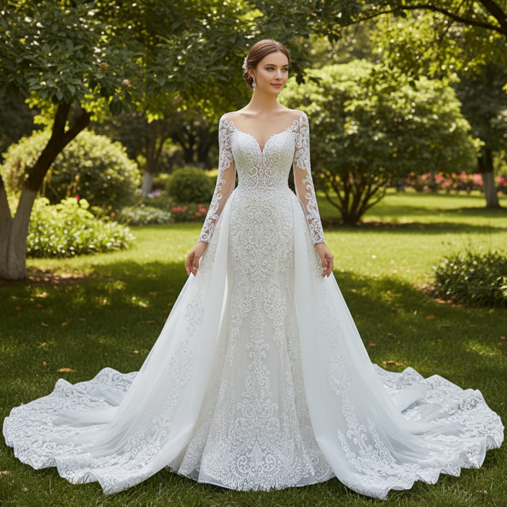 Step into timeless sophistication with this exquisite handmade wedding dress, where vintage charm meets modern versatility. The delicate long sleeves, adorned with intricate beaded lace, create an air of classic romance while offering elegant coverage. The luxurious detachable skirt allows you to transform your silhouette from a dramatic ball gown for your ceremony to a sleek mermaid or trumpet style for your reception.