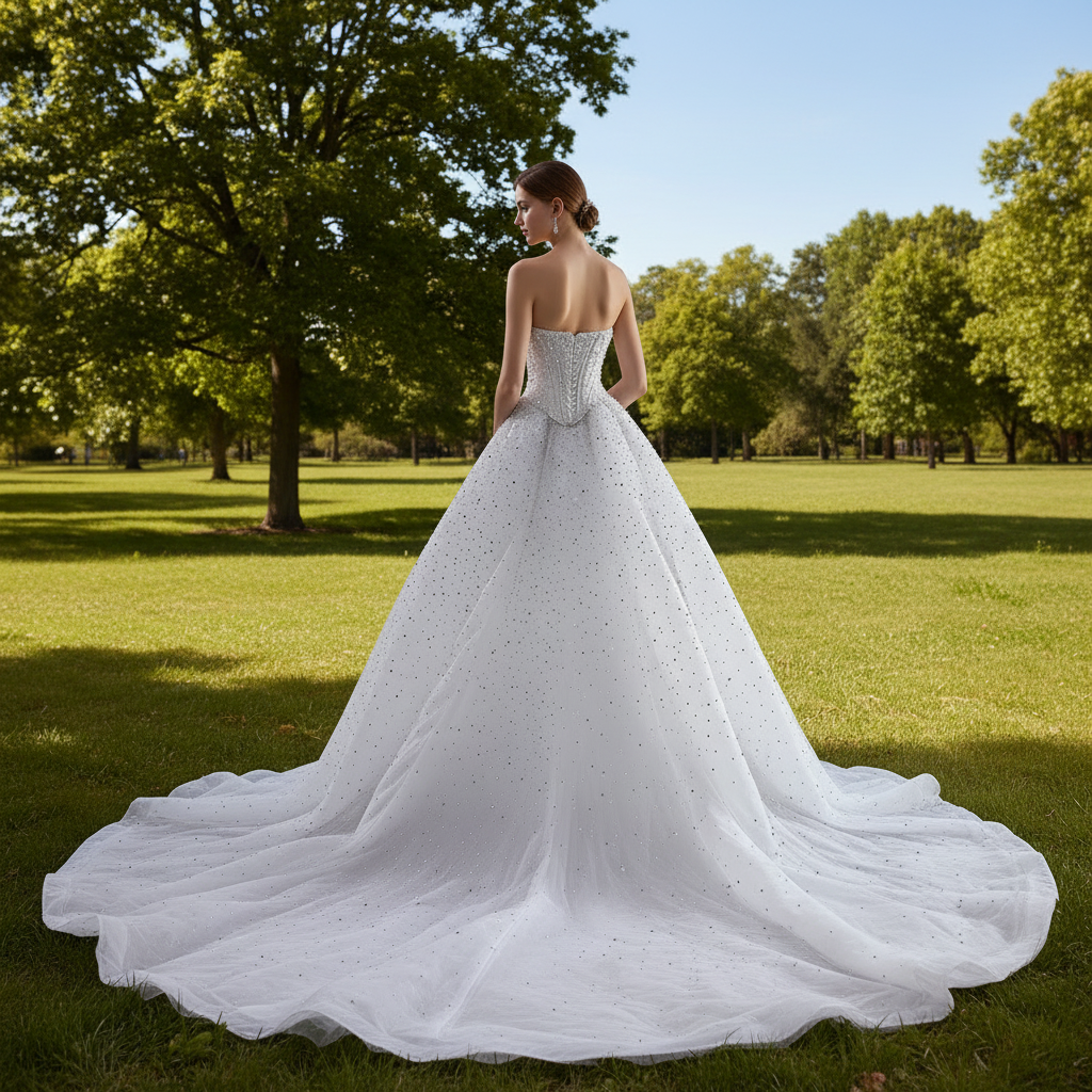 The foundation of this gown is a structured corset bodice, designed to sculpt and support. Whether you prefer a romantic off-the-shoulder look or a timeless strapless neckline, this dress delivers a flawless fit. The look is finished with exquisite sheer or lace-up back detailing, adding a touch of allure to the silhouette.