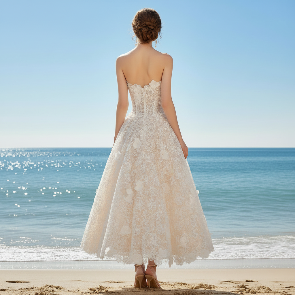 This elegant tea-length and ankle length floral lace wedding dress featuring a-line silhouette, strapless neckline with handmade flowers, open back with zipper closure.