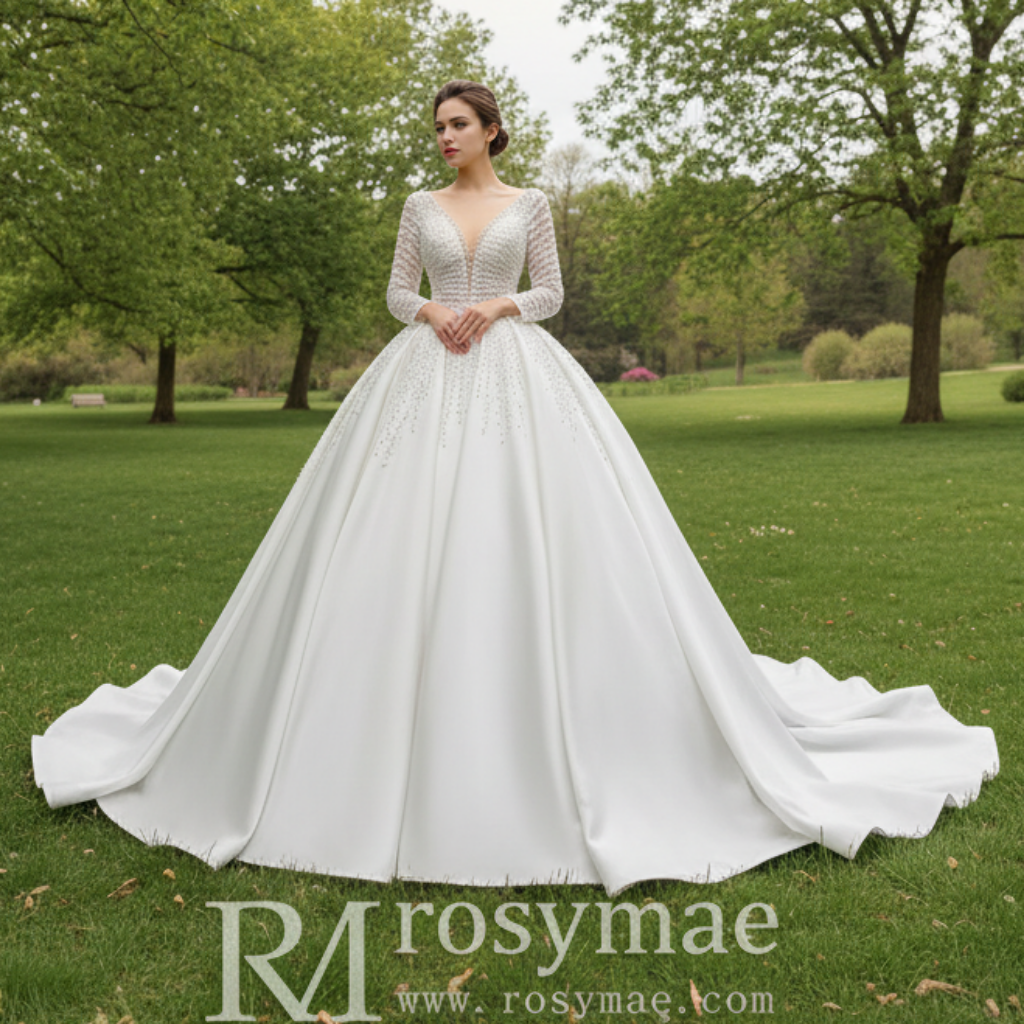 Step into your fairy tale moment wearing this breathtaking vintage-inspired ball gown, meticulously handcrafted to capture timeless romance with contemporary sophistication. This stunning long-sleeve wedding dress features lustrous pearl satin that catches light beautifully, creating an ethereal glow as you walk down the aisle. Intricate beading adorns the bodice and sleeves, adding luxurious sparkle and dimension that photographs magnificently. The flattering V-neckline elegantly frames your face and décolletage, while the structured corset back provides both support and a touch of attractive. The voluminous ball gown skirt creates that coveted princess silhouette, offering dramatic movement and presence without compromising comfort or grace. Every stitch reflects exceptional craftsmanship, from the delicate pearl embellishments to the perfectly proportioned proportions that flatter all body types. The minimalist design philosophy ensures the dress's inherent beauty takes center stage, allowing your natural radiance to shine through. Whether you're planning a grand traditional celebration or an intimate vintage-themed affair, this gown delivers the perfect balance of classic elegance and modern sensibility. Feel absolutely stunning and utterly confident as you celebrate your love story in a dress that's as unique and special as you are.