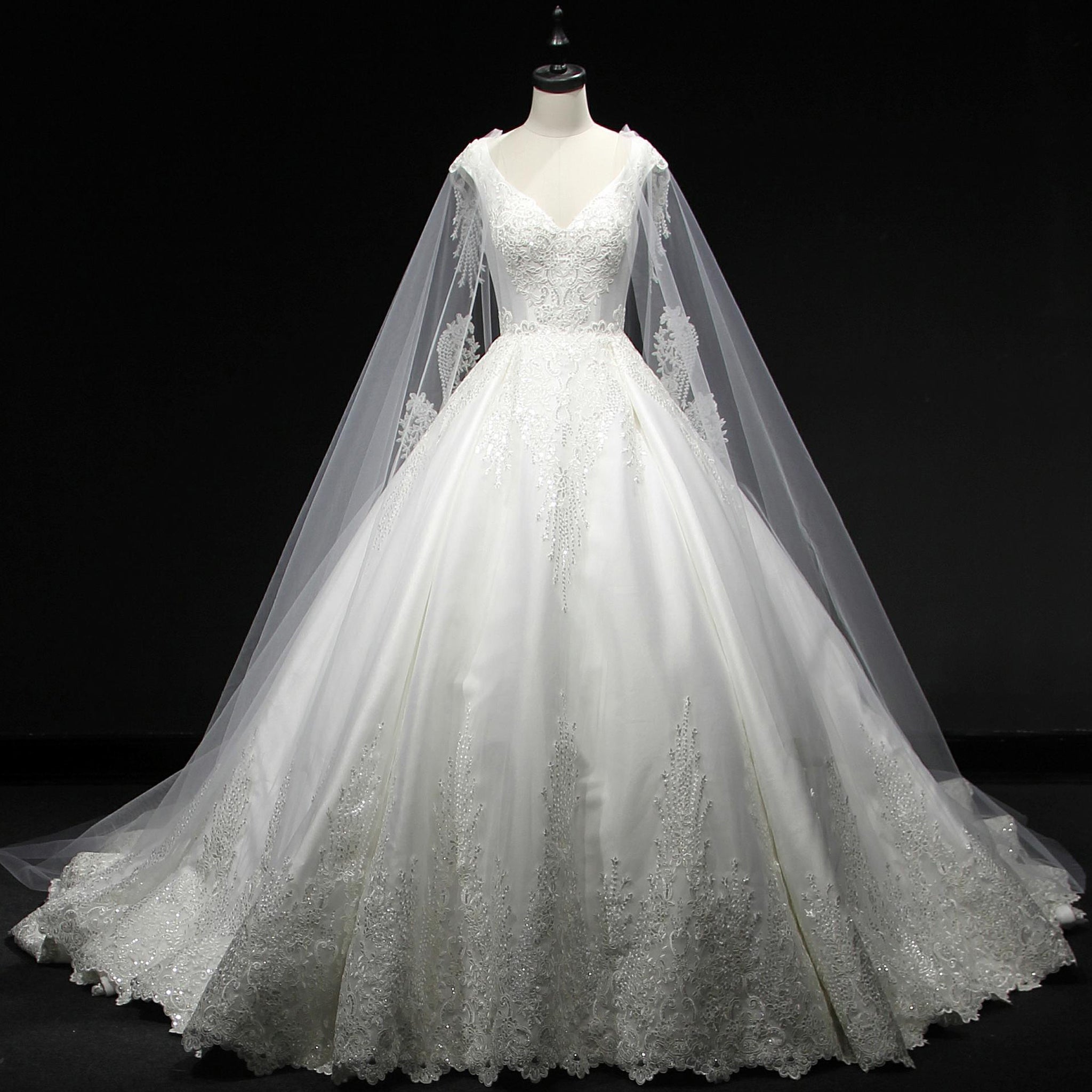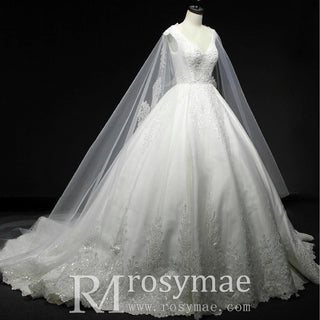 Elevate your special day wearing this classic v-neck ball gown wedding dress. The detailed train is perfect to add drama and sophistication to your special day. Crafted from highest quality fabric, this wedding dress will provide you with all-day comfort and confidence. Indulge in the luxury of this elegant wedding gown.