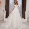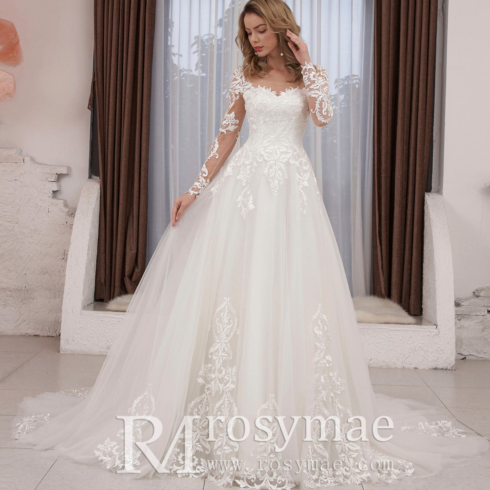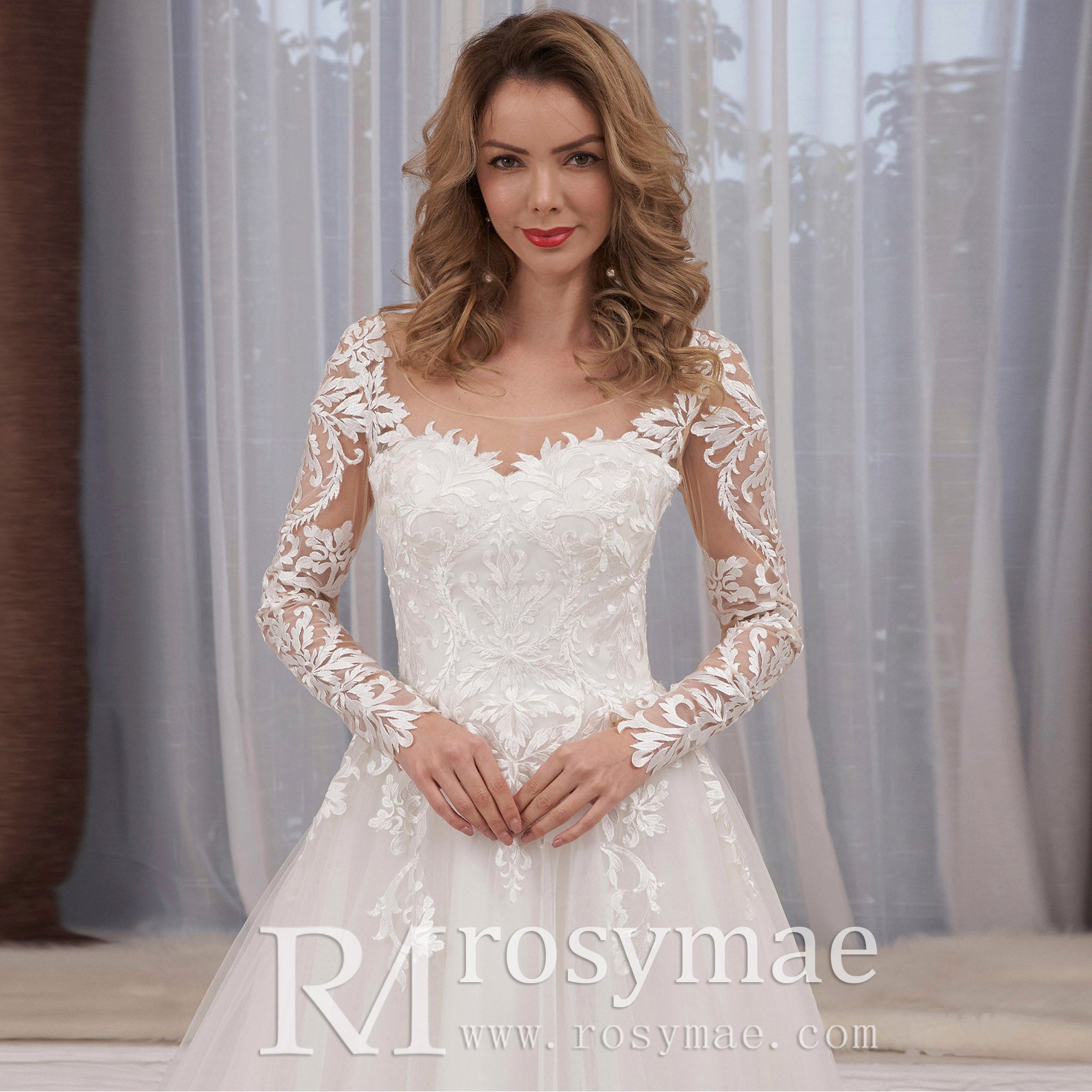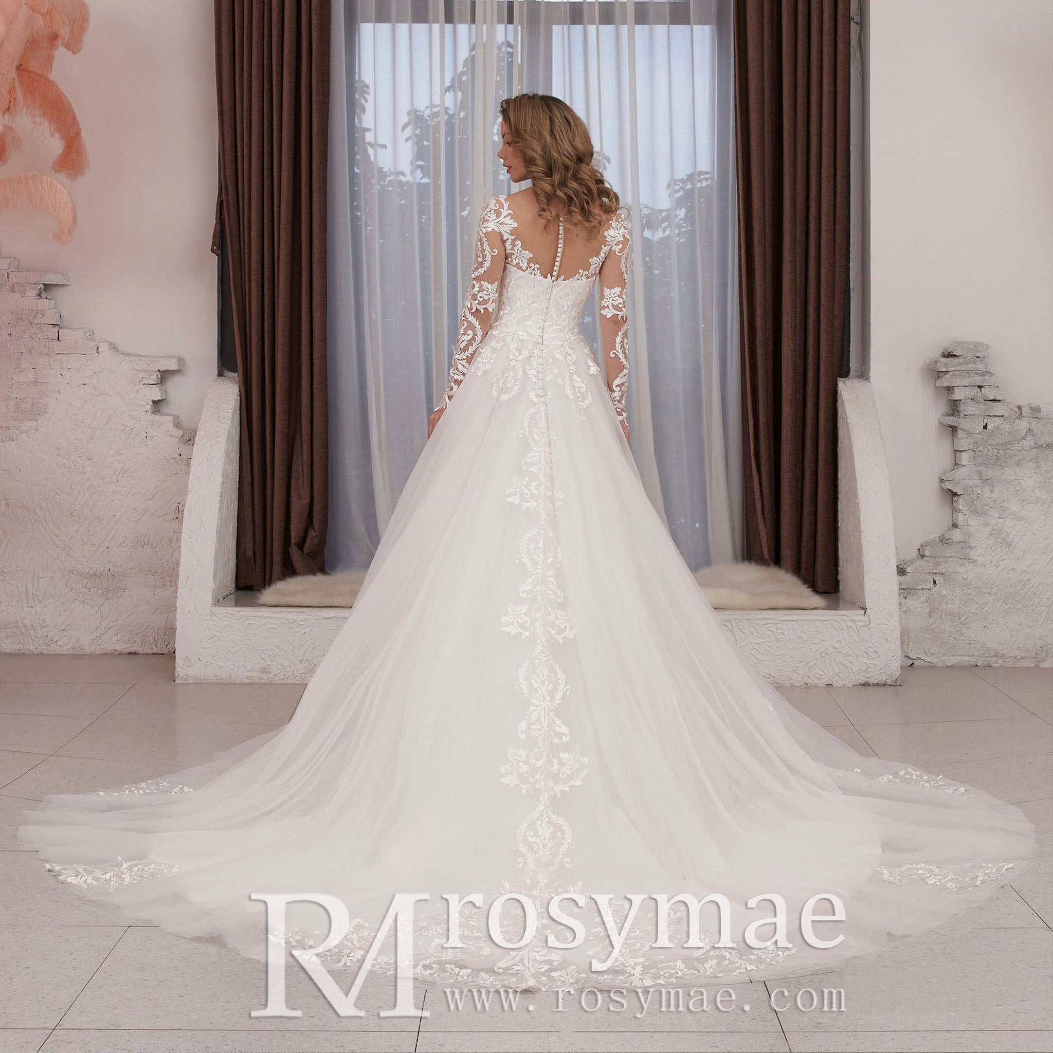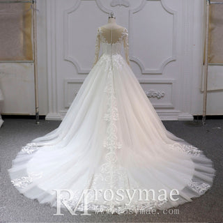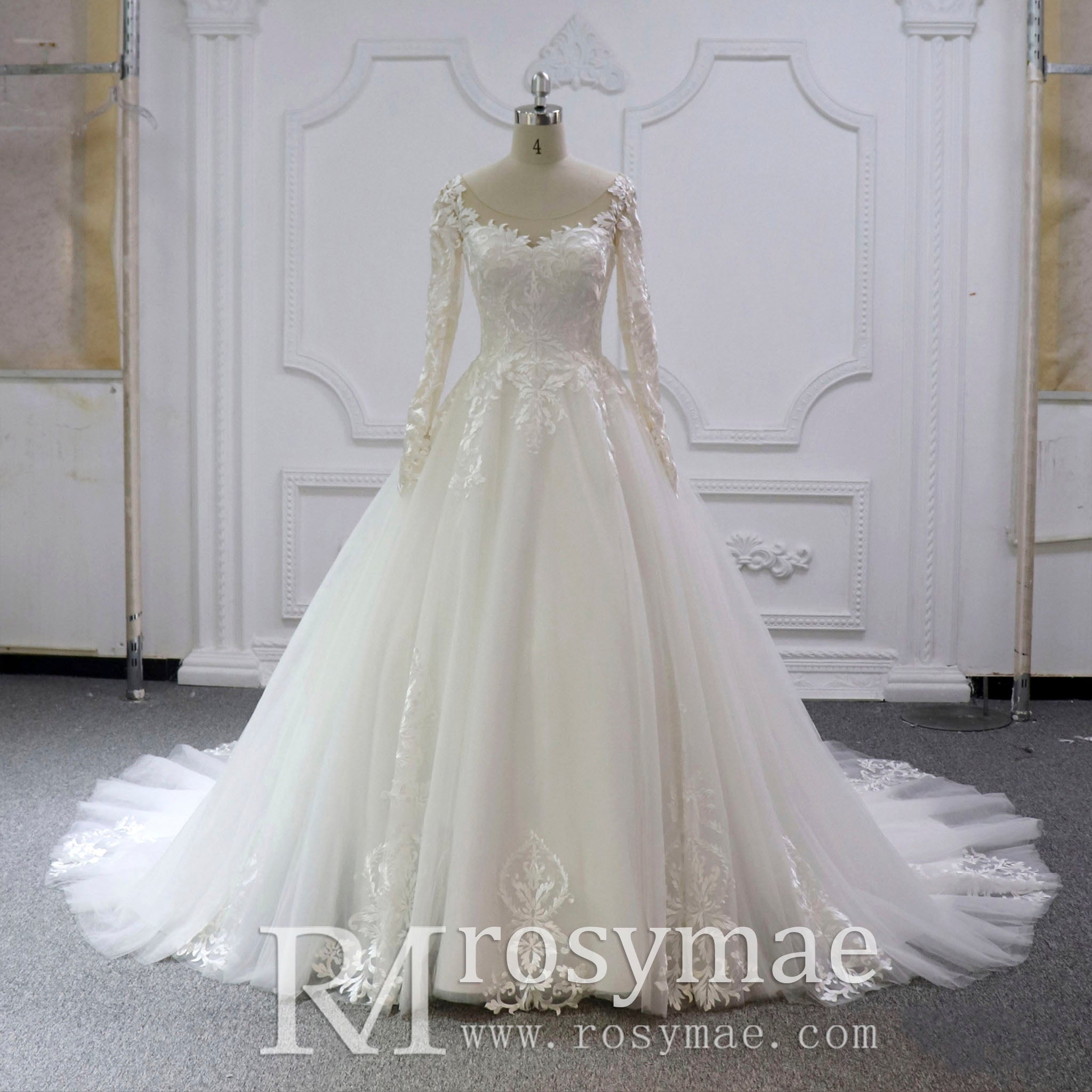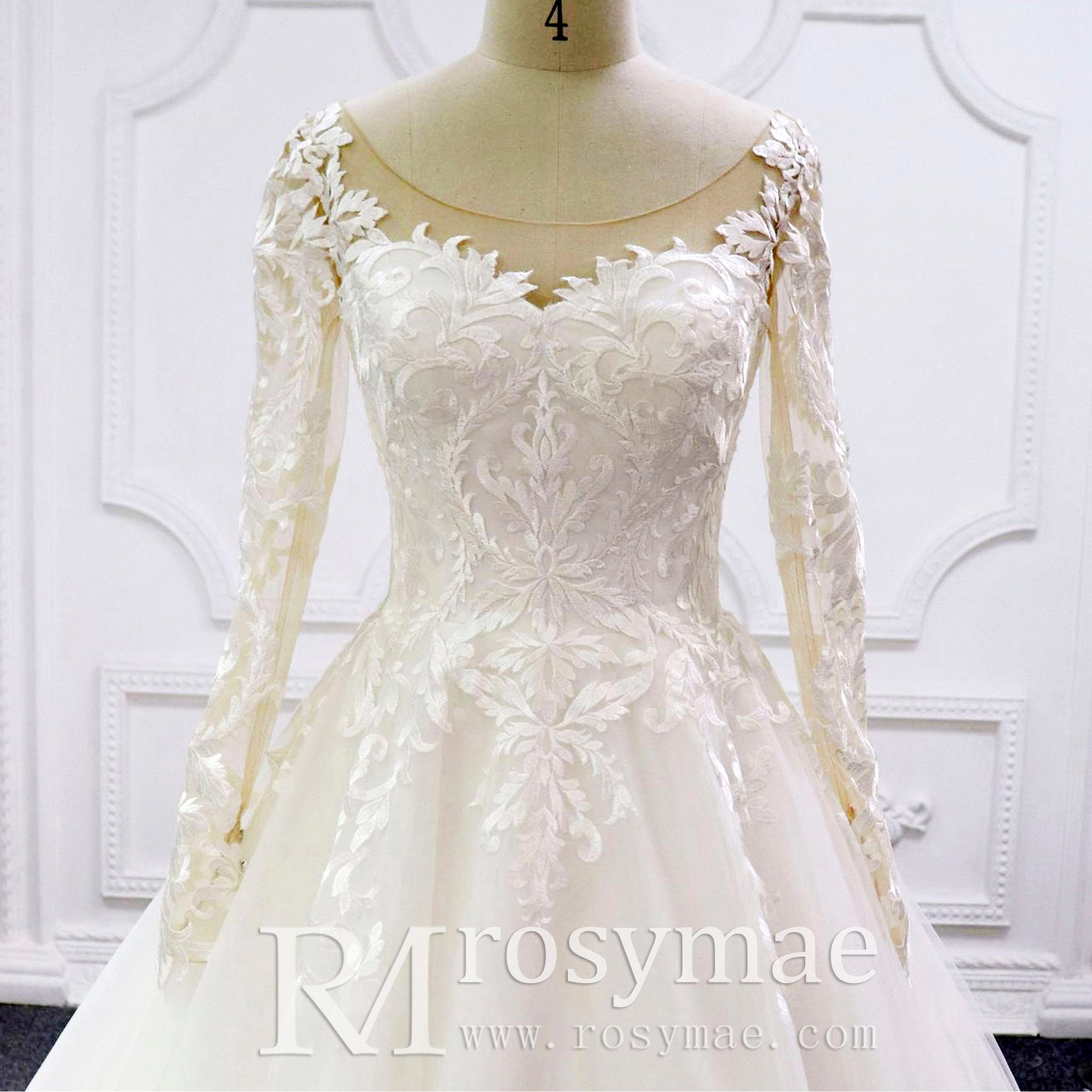 Fancy floral lace and tulle a-line wedding dress with long sleeve, sheer neckline covered lace applique, multi layered bling tulle skirt with floral lace, illusion high back with a line of buttons, cathedral train.