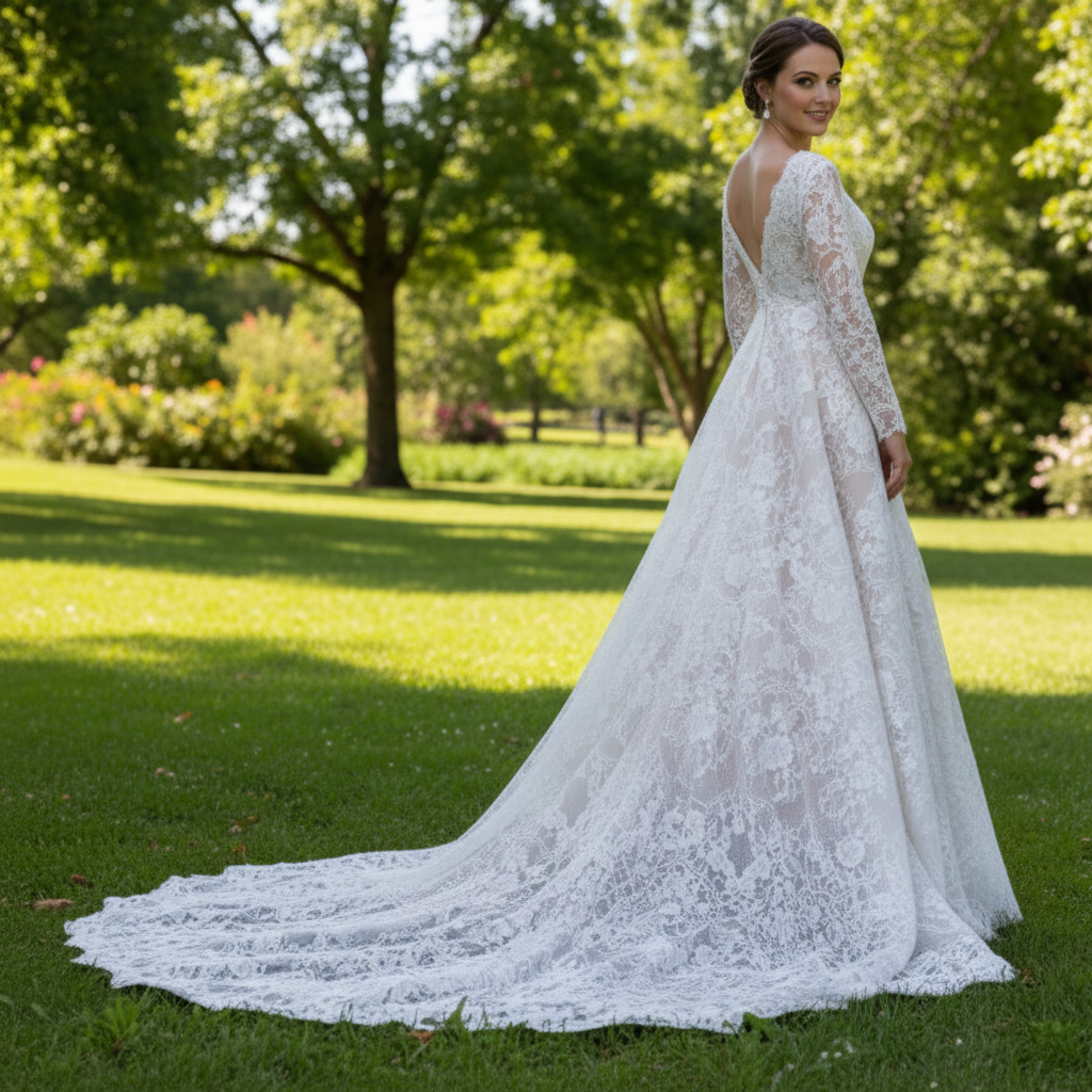 This stunning bridal gown features a delicate floral lace that covers the entire dress, adding texture and elegance to your wedding day look. With a double V neckline and flattering A-line silhouette, this dress is the perfect blend of romance and sophistication. Make a statement on your special day with this beautiful lace wedding dress.
