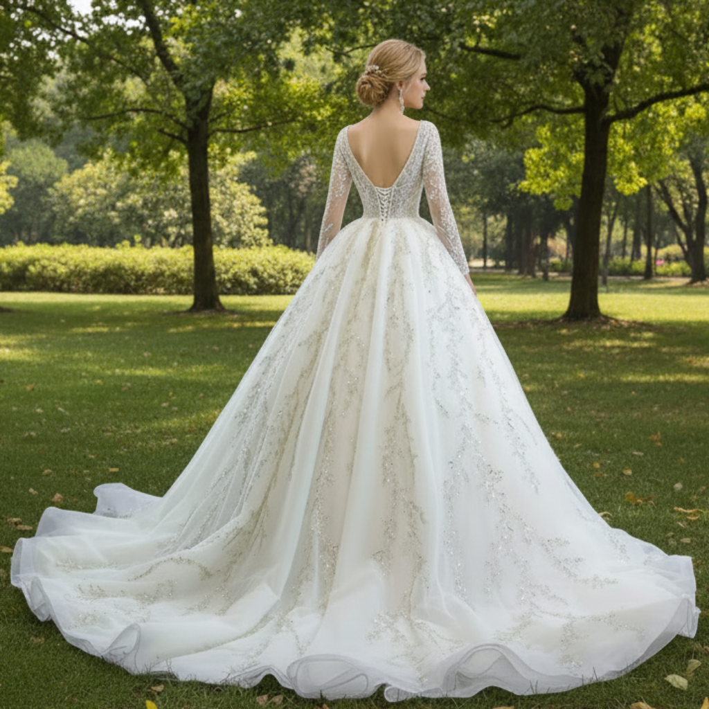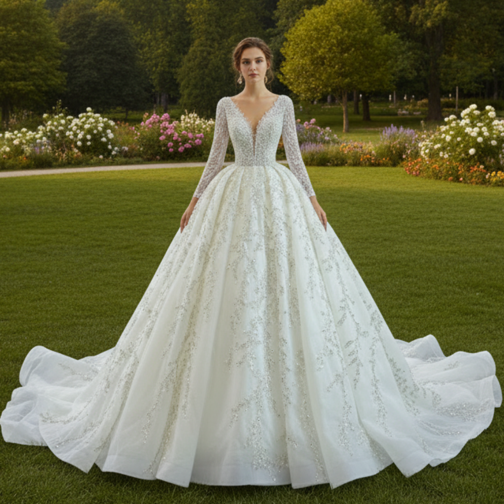 The gown's elegant long sleeves feature carefully placed crystal and pearl embroidery, evoking the grace of bygone eras while providing modest coverage. The structured bodice, reinforced with flexible boning, ensures both comfort and a flattering fit, while the voluminous skirt flows into a cathedral-length train that adds drama and grandeur to your entrance. Perfect for traditional ceremonies, royal-themed weddings, or vintage-inspired celebrations, this dress transforms you into the princess you've always dreamed of becoming.
