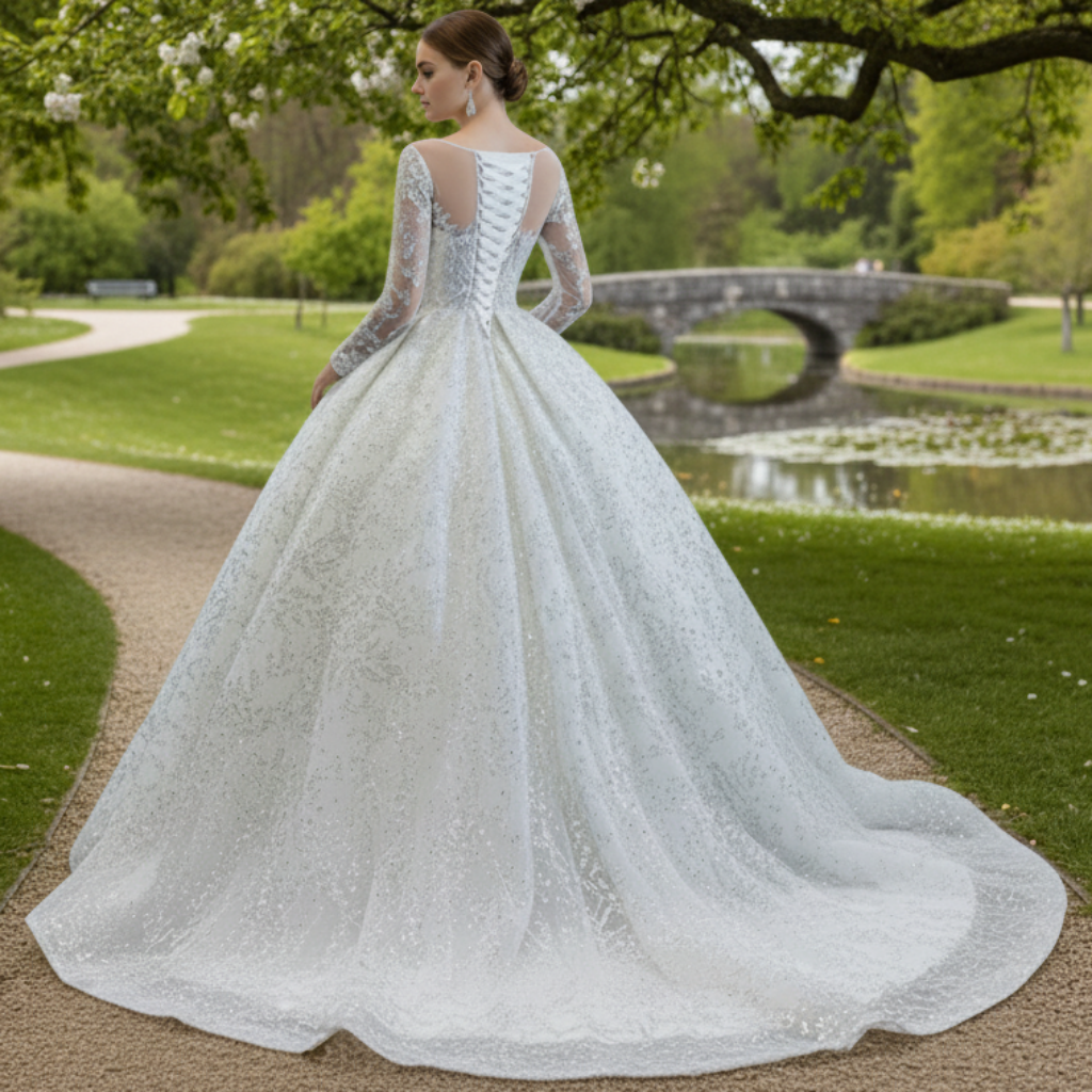Radiate pure elegance in this exquisitely handcrafted ball gown, designed for brides who appreciate timeless luxury and meticulous artistry. Every inch of this stunning bridal gown is adorned with lustrous beading and shimmering sequins, creating a captivating sparkle that catches light from every angle. The modest scoop neckline and full-length sleeves offer graceful coverage while maintaining an air of sophisticated romance, making this dress perfect for traditional ceremonies or vintage-inspired celebrations. The voluminous ball gown silhouette creates a dramatic, princess-like presence, flattering your natural curves while allowing effortless movement throughout your special day. The structured corset back provides exceptional support and a flattering fit, ensuring you feel secure and confident as you celebrate. Intricate beadwork covers the bodice and extends throughout the skirt, showcasing exceptional handmade craftsmanship that sets this gown apart from mass-produced alternatives. The sparkling accents dance beautifully in photographs and candlelight, creating magical moments you'll treasure forever. Whether you envision a grand ballroom celebration, an elegant garden ceremony, or a luxurious destination wedding, this gown delivers the opulence and refinement you deserve. Feel like royalty as you walk down the aisle in a dress that embodies timeless beauty, exceptional quality, and the luxury you've always dreamed of.