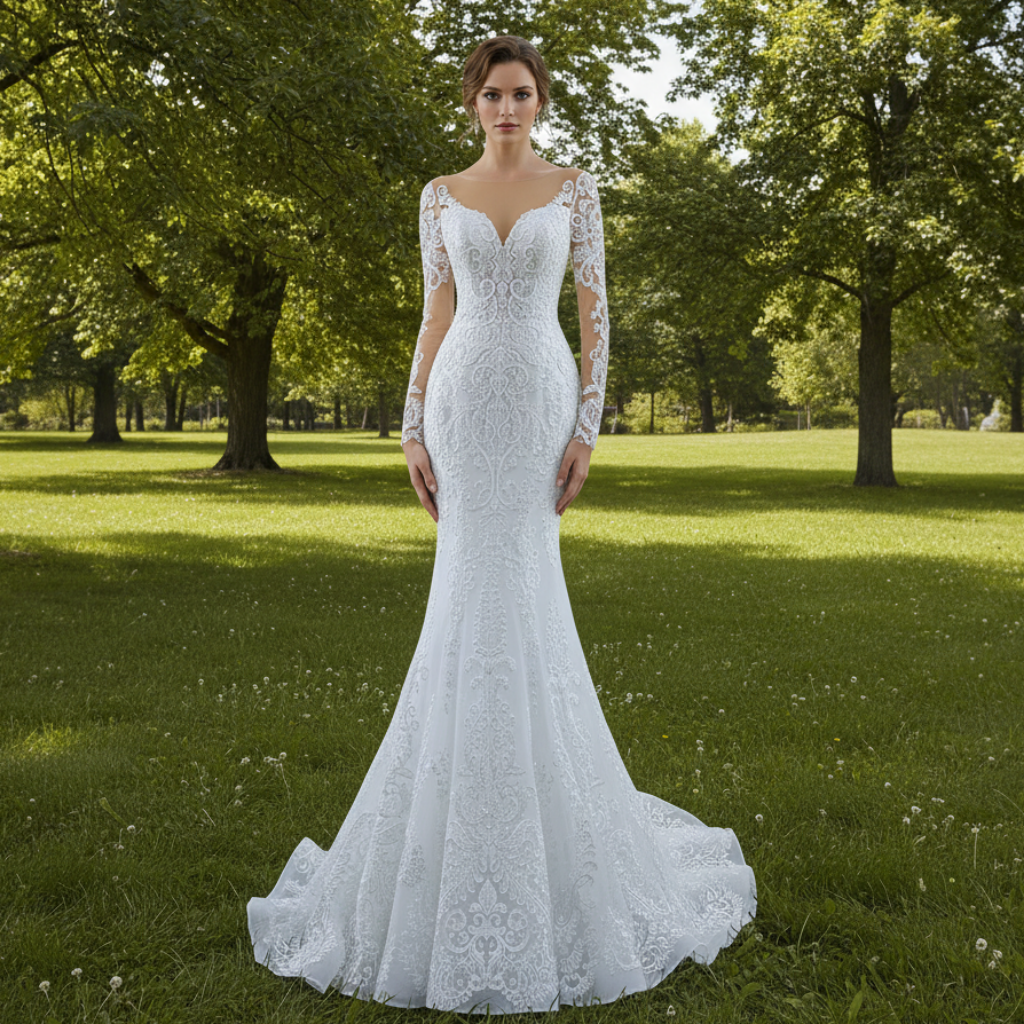 Step into timeless sophistication with this exquisite handmade wedding dress, where vintage charm meets modern versatility. The delicate long sleeves, adorned with intricate beaded lace, create an air of classic romance while offering elegant coverage. The luxurious detachable skirt allows you to transform your silhouette from a dramatic ball gown for your ceremony to a sleek mermaid or trumpet style for your reception.