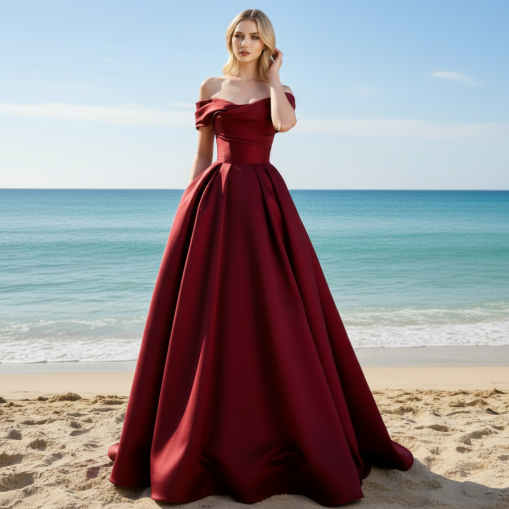 This elegant off-the-shoulder satin A-line formal dress features a flattering boat neck and low back, and a breathtaking chapel train. Perfect for prom or any formal event, this dress is available in a stunning claret color. Experience comfort, style, and sophistication with this must-have gown.