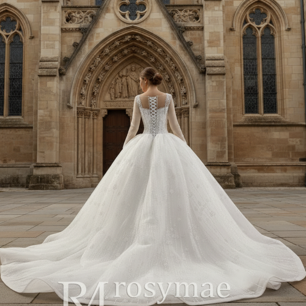 Make a stunning statement on your wedding day with this gorgeous sheer square neckline ball gown wedding dress, expertly designed to blend elegance with timeless beauty. The delicate sheer square neckline draws attention to your collarbone while maintaining a modest and refined look, perfectly complemented by an intricate lace-up back that adds a touch of classic sophistication and ensures a flawless fit tailored just for you. The voluminous skirt creates a dramatic, fairy-tale silhouette that flows gracefully with every step, empowering you with confidence and grace. Adorned with sparkling details and pearl accents throughout, this gown radiates luxury and glamour, elevating your bridal style to unforgettable heights. Thoughtfully crafted with modesty and Muslim-friendly design in mind, it allows every bride to celebrate her special day feeling radiant, elegant, and comfortable. Impeccable tailoring and exquisite craftsmanship combine to deliver a breathtaking gown that embodies both tradition and contemporary beauty. For a wedding experience as exceptional as you are, this dress ensures you shine brilliantly from the aisle to the last dance—because on your special day, nothing less than perfection will do.