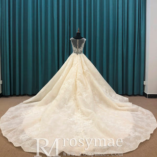 Sparkly Lace Long Sleeves Illusion Boat Neck Ball Gown Wedding Dress